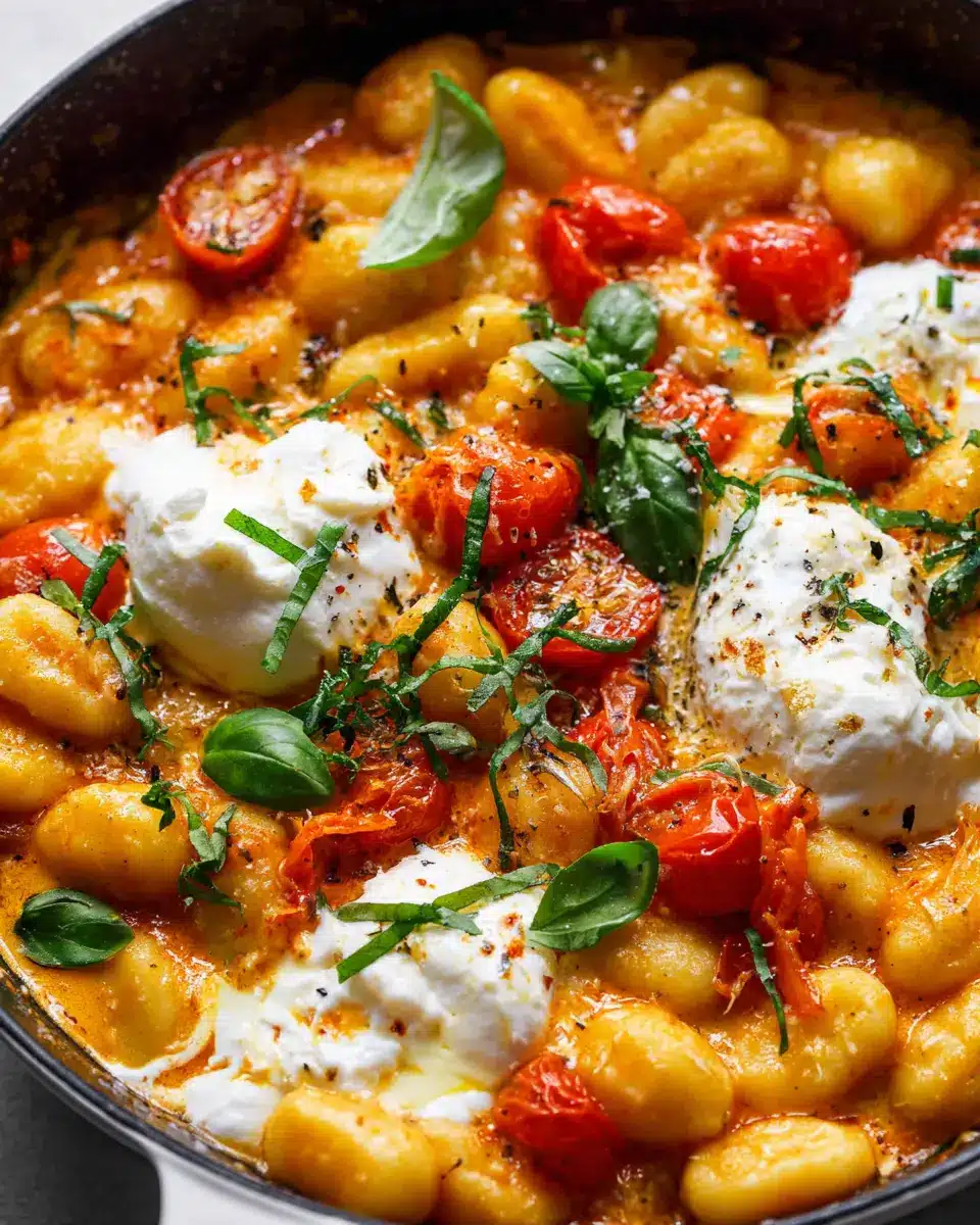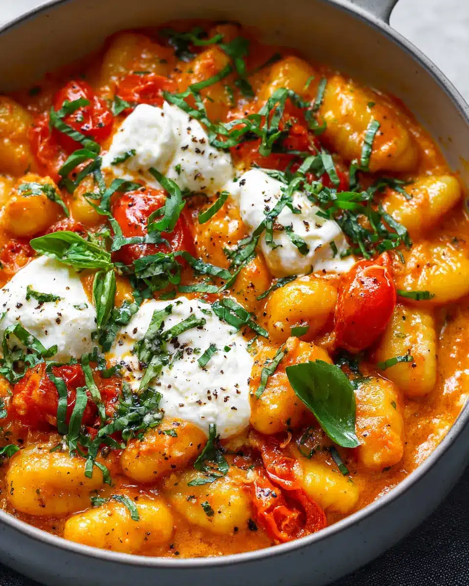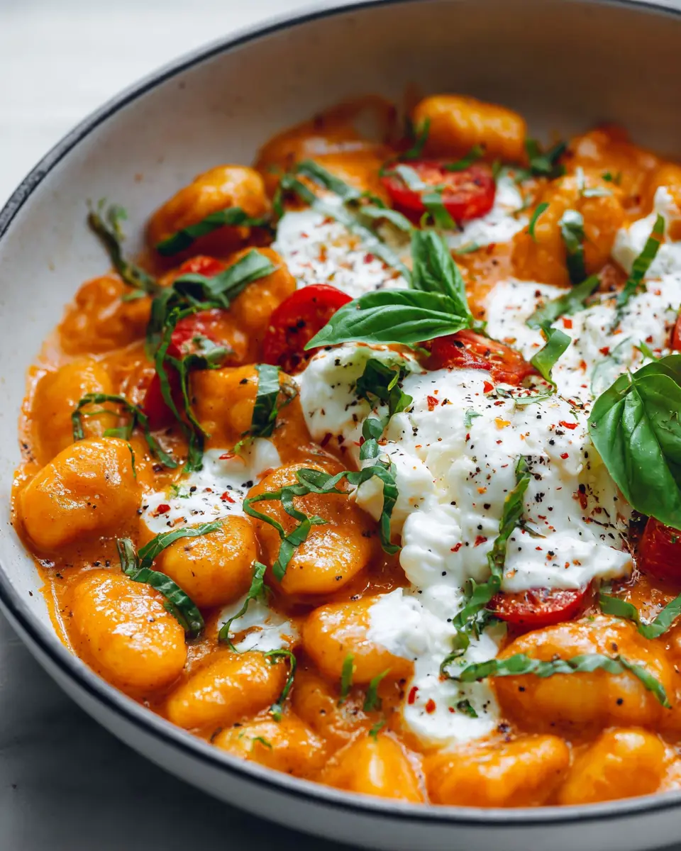 Don’t forget the potato gnocchi and fresh burrata cheese—both of which take this recipe from good to amazing! For a garden-fresh finish, add some basil leaves, either sliced or torn to preserve that fragrant aroma.