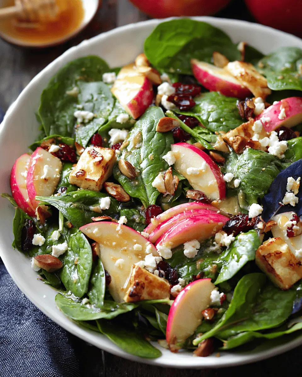 The harmony of flavors in this salad is truly what sets it apart. The tartness of the apples complements the slight bitterness of spinach, creating an exciting taste contrast in every bite. Drizzled with a homemade honey vinaigrette, each mouthful bursts with a light sweetness that perfectly balances the saltiness from the crumbled feta cheese.