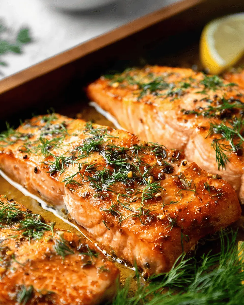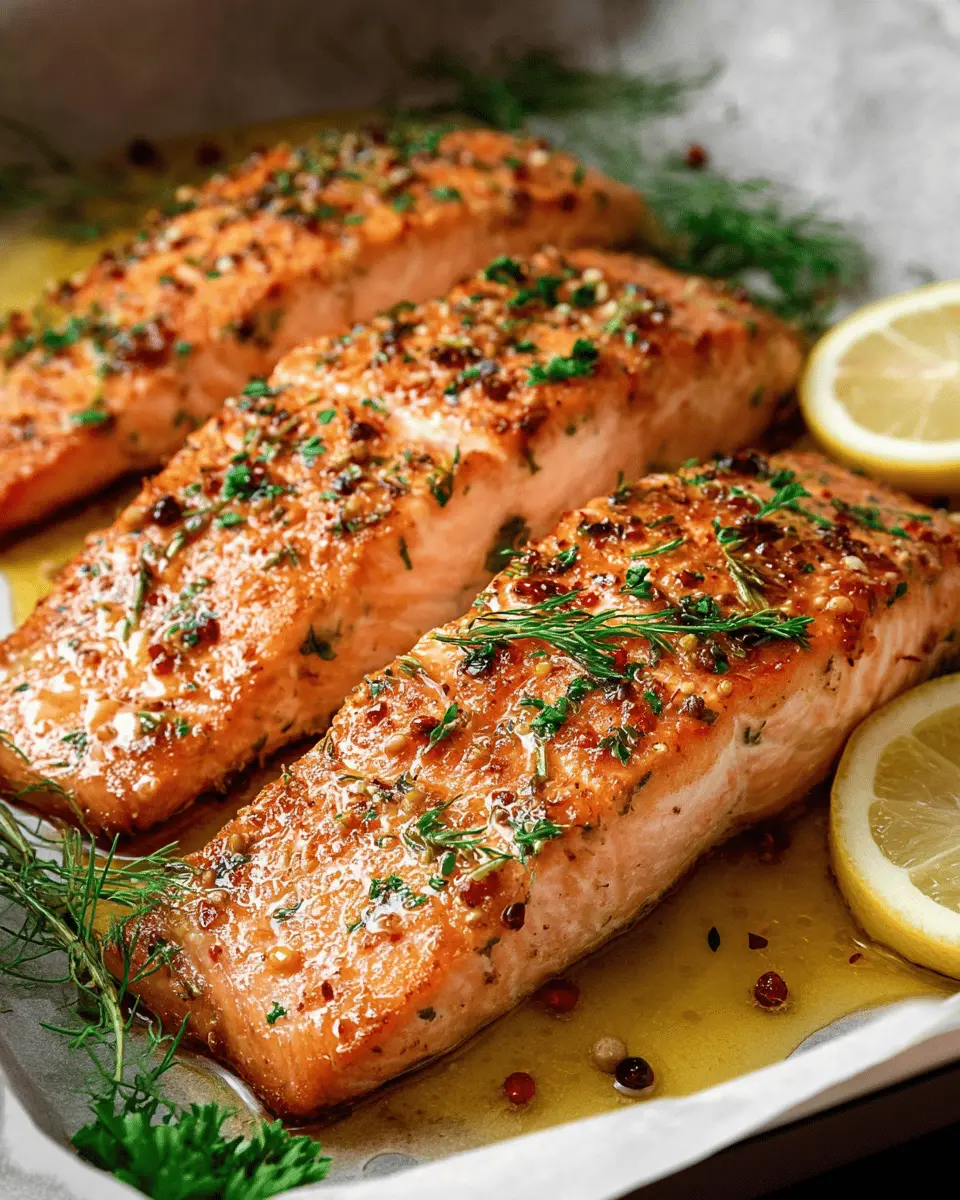 Once your best baked salmon is done, it's time to impress! Sprinkle some finely chopped parsley and dill on top for an aromatic finish. If you have some extra lemon slices, place them on or around the fillets for a beautiful presentation.