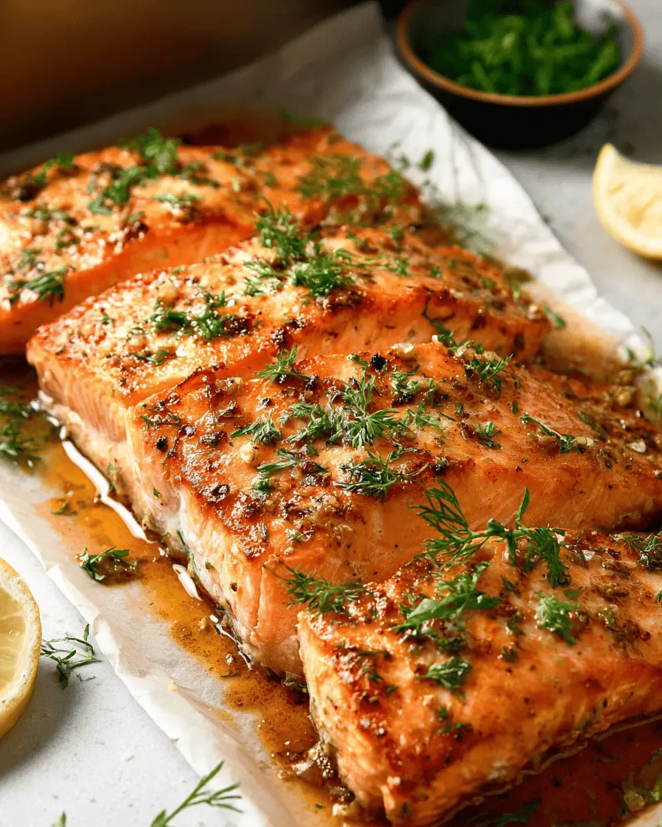 Now that your salmon is prepped and your butter mixture is ready, it’s time to add flavor! Brush the melted butter and lemon mix generously over the salmon fillets. Sprinkle minced garlic (3 cloves should do) across the fish, along with kosher salt and freshly ground black pepper. Don’t be shy with the seasoning; it’s essential for bringing out those delicious salmon flavors.
