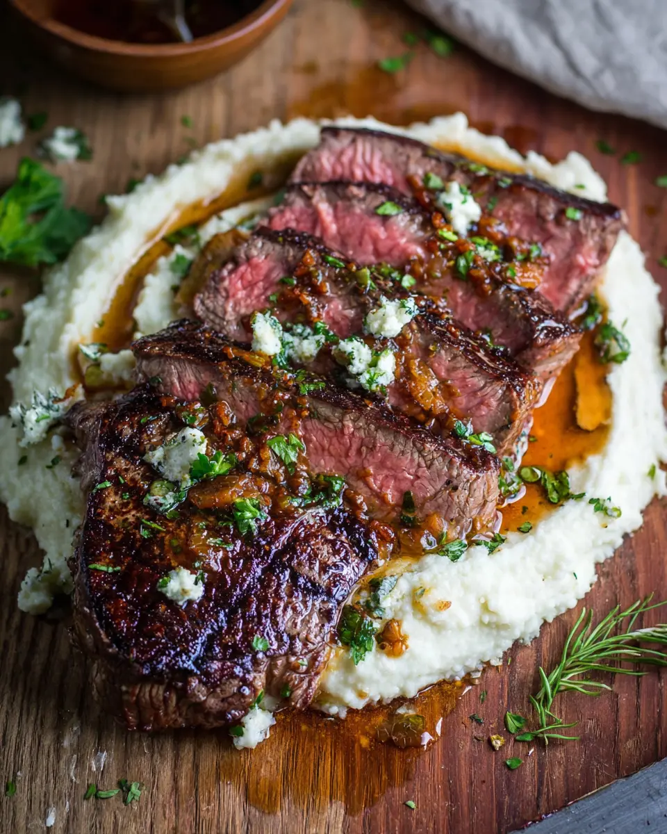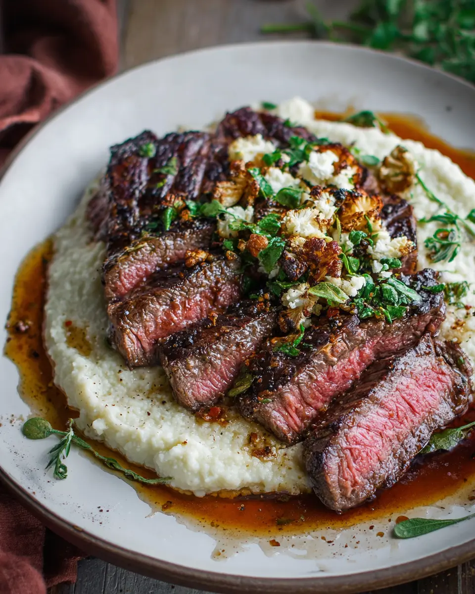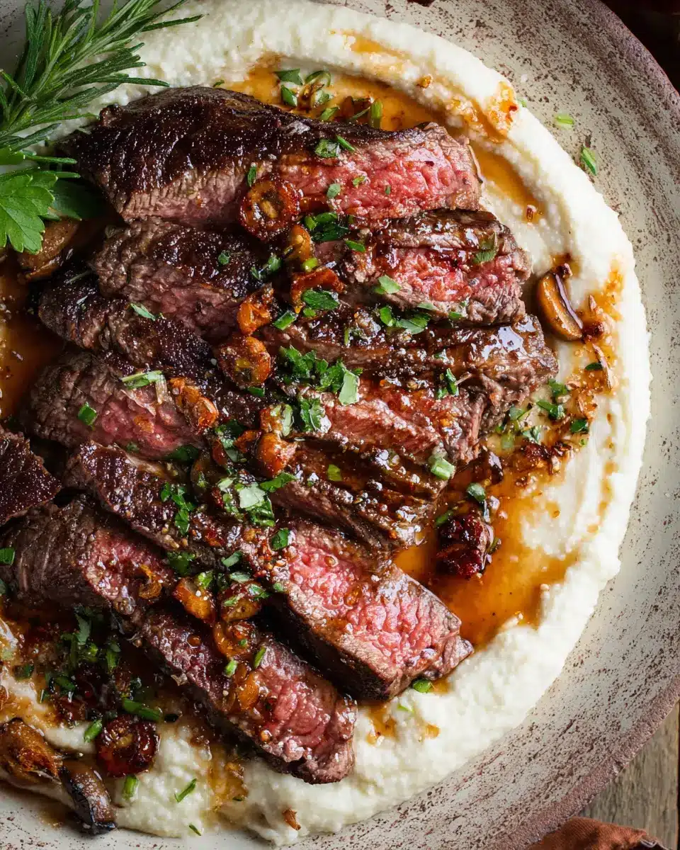 Finally, slice your rested steaks against the grain, revealing that perfect pink interior. On a large platter, spoon the whipped cauliflower and elegantly arrange the sliced steak on top. Drizzle everything with that heavenly brown butter sauce and garnish with the crispy garlic and a pinch of flaky sea salt.