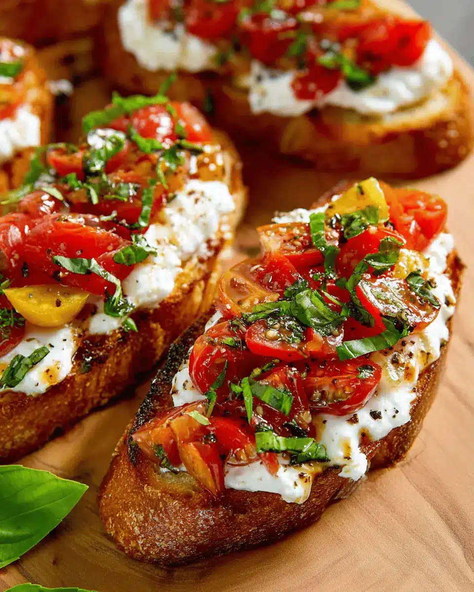 Getting everything prepped for your burrata bruschetta takes about 15 minutes. You’ll want to mix your fresh tomato topping and get the bread ready for that perfect crispiness.