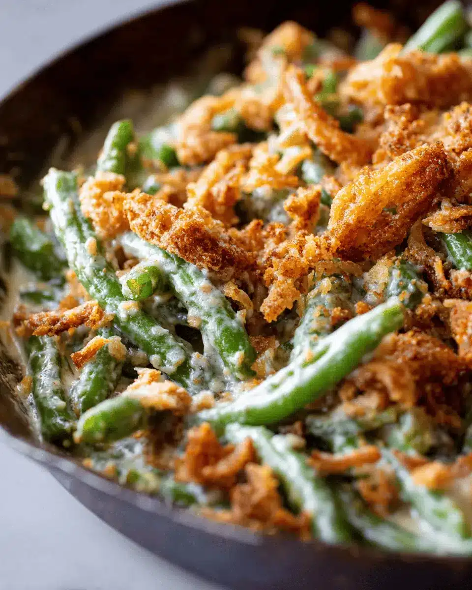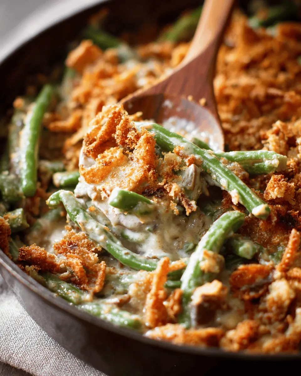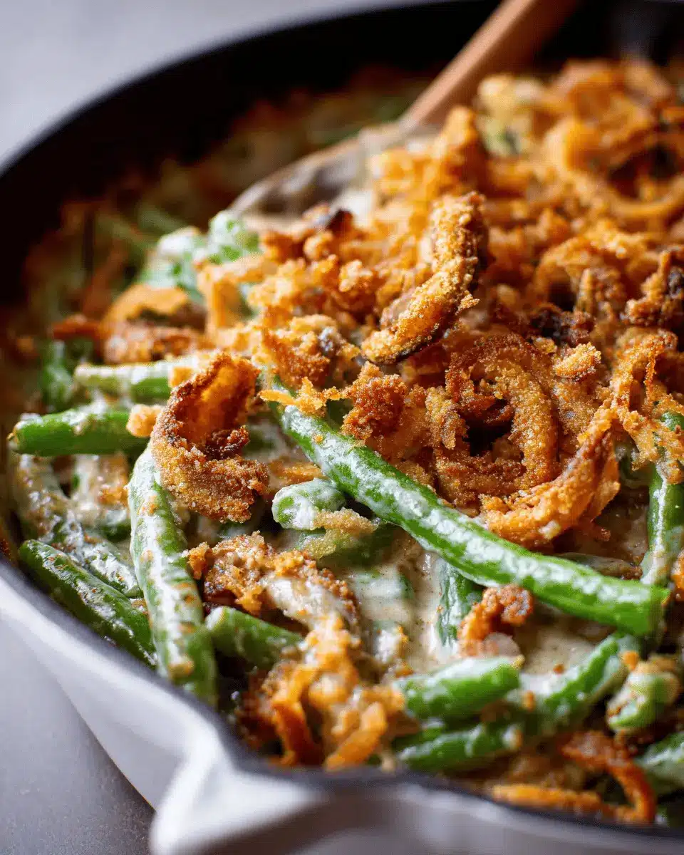 While the classic creamy green bean casserole is a holiday staple, feel free to get creative with the toppings! Instead of the usual crispy fried onions, consider crispy turkey bacon bits or a sprinkle of fresh herbs like thyme or parsley. You could also experiment with crushed potato chips for a different crunch. For added flavor, mix in some shredded cheese or toasted nuts—a delightful twist that will leave your guests asking for the recipe!