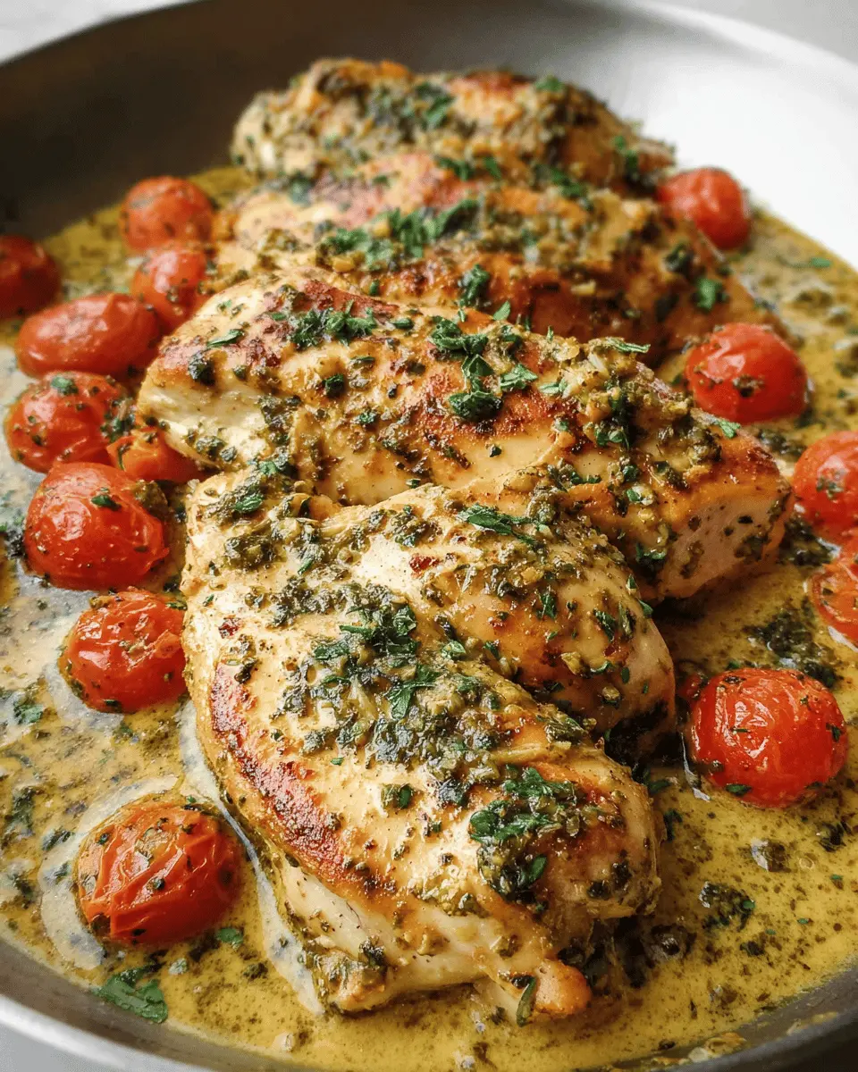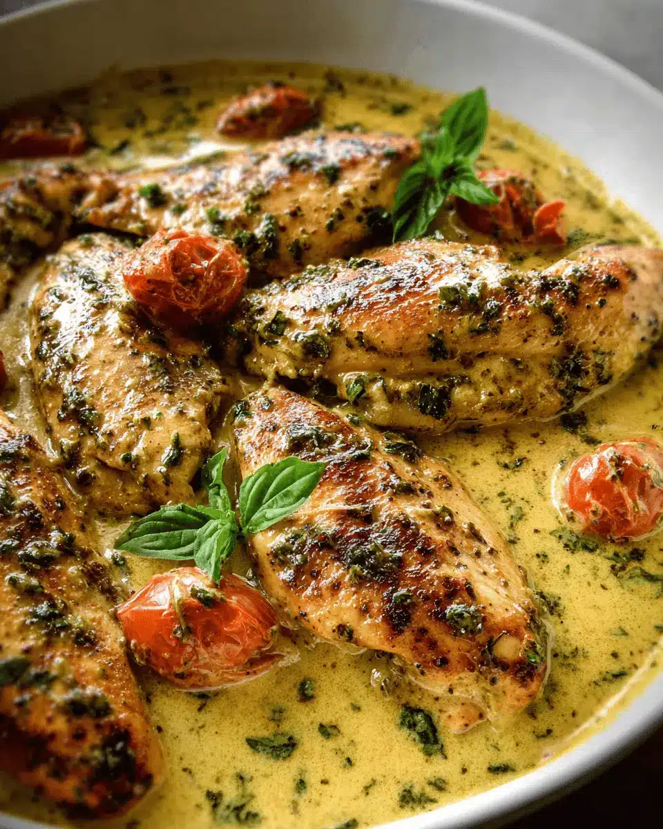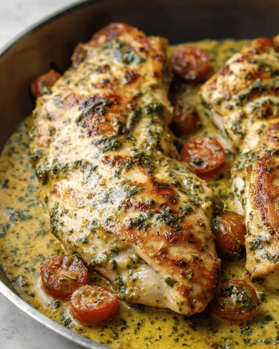Finally, it’s time to bring everything together! Add the chicken back to the skillet, making sure to coat it in that luscious sauce. Let the chicken simmer for just a few more minutes until it’s heated through. This is your moment to shine—serve your creamy pesto chicken hot, perhaps over pasta or with some crusty bread to mop up the sauce.