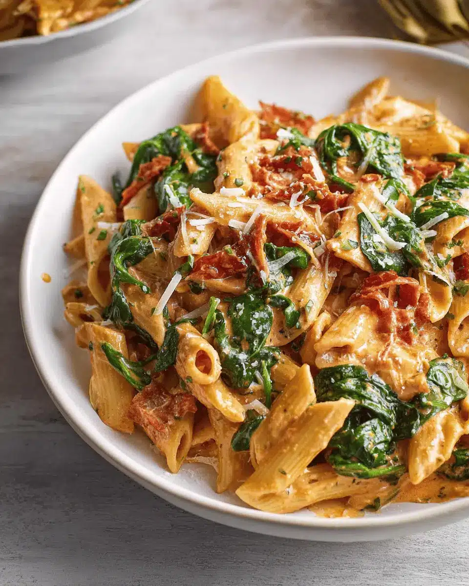 Looking to amp up the protein in your creamy tomato and spinach pasta? Consider adding sautéed chicken or crispy turkey bacon. Chicken breast, cooked to perfection and sliced, complements the creamy sauce beautifully, while turkey bacon provides a smoky contrast. Simply cook your protein of choice alongside the onions and garlic for an all-in-one flavor adjustment.