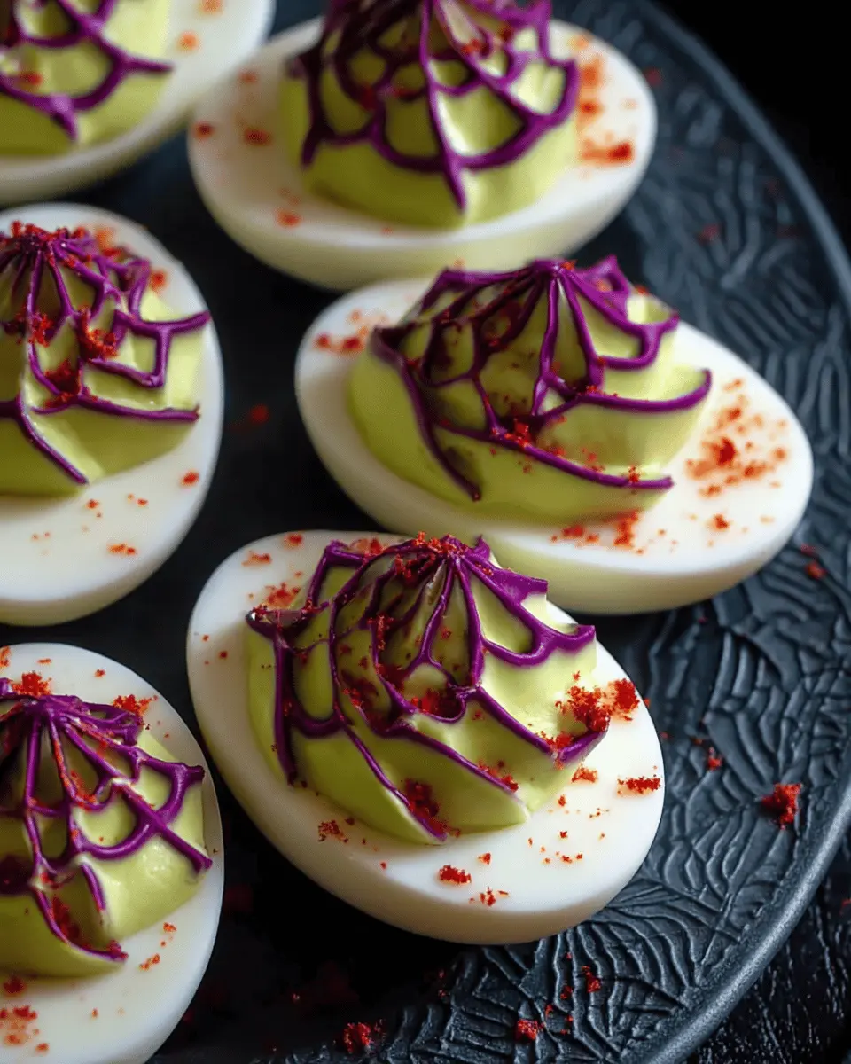 Elevate your creepy deviled eggs with an eye-catching presentation! Consider using a spooky black platter or a cobweb-patterned tablecloth to set the scene. For added flair, nestle the eggs atop a bed of chopped lettuce or moss (edible moss can be made from crushed spinach or kale) to give the illusion they’ve just emerged from a haunted forest. You can even add some miniature plastic spiders around the plate for a playful touch that will get guests talking!