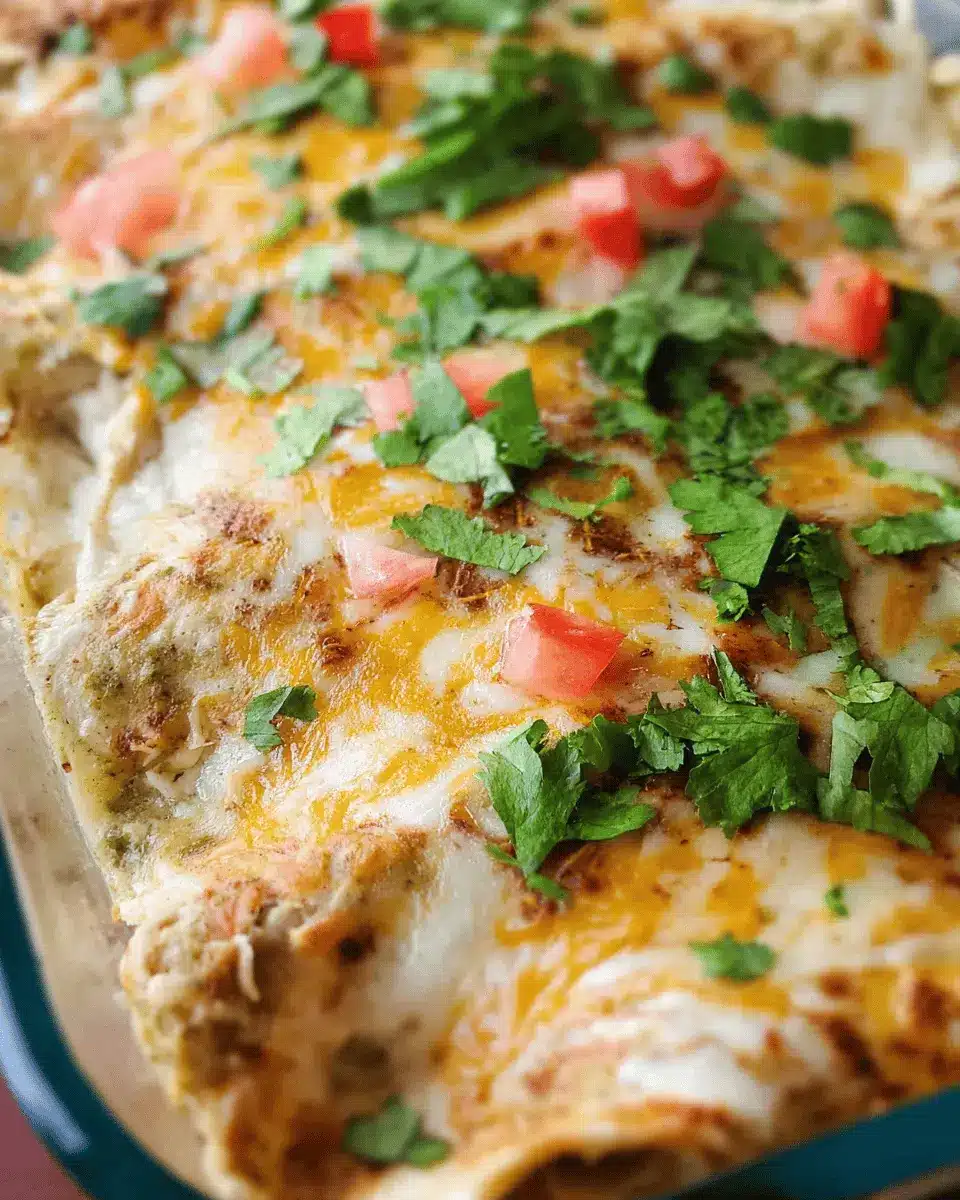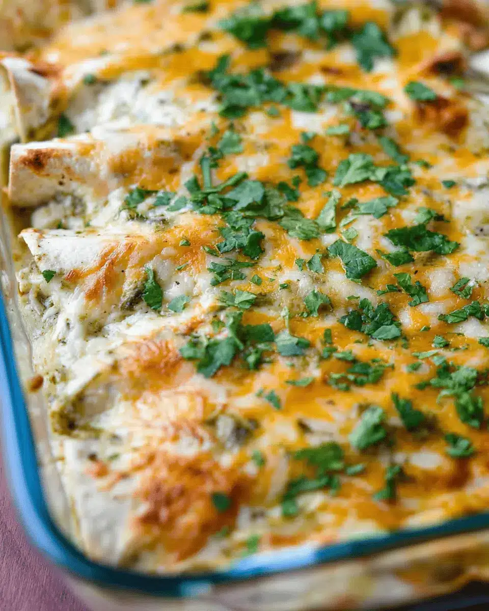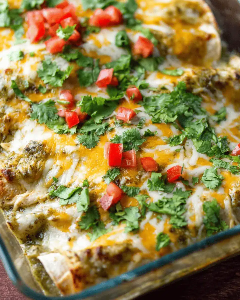 Cover your baking dish with aluminum foil to trap in the steam, which helps the enchiladas cook evenly. Bake for 15 minutes and then remove the foil. Return the dish to the oven and bake for an additional 10 minutes, or until the cheese turns golden brown and bubbly. Allow your easy green chicken enchiladas to cool for 5 to 10 minutes before serving; this helps set everything nicely. Garnish with fresh cilantro for that extra pop of flavor and presentation.