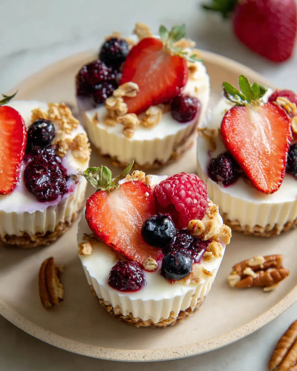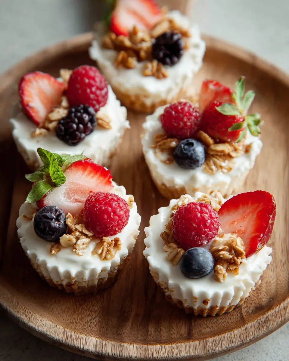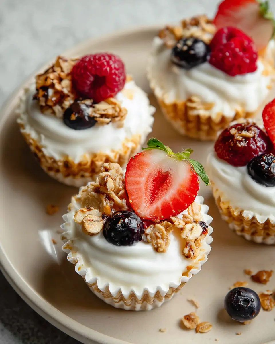 Here comes the fun part—customizing your frozen yogurt granola cups! Top each yogurt-filled cup with a handful of sliced berries or your favorite fruit. For an extra crunch, sprinkle some chopped walnuts on top. A light drizzle of honey adds a sweet touch if you’re in the mood for something a bit indulgent.