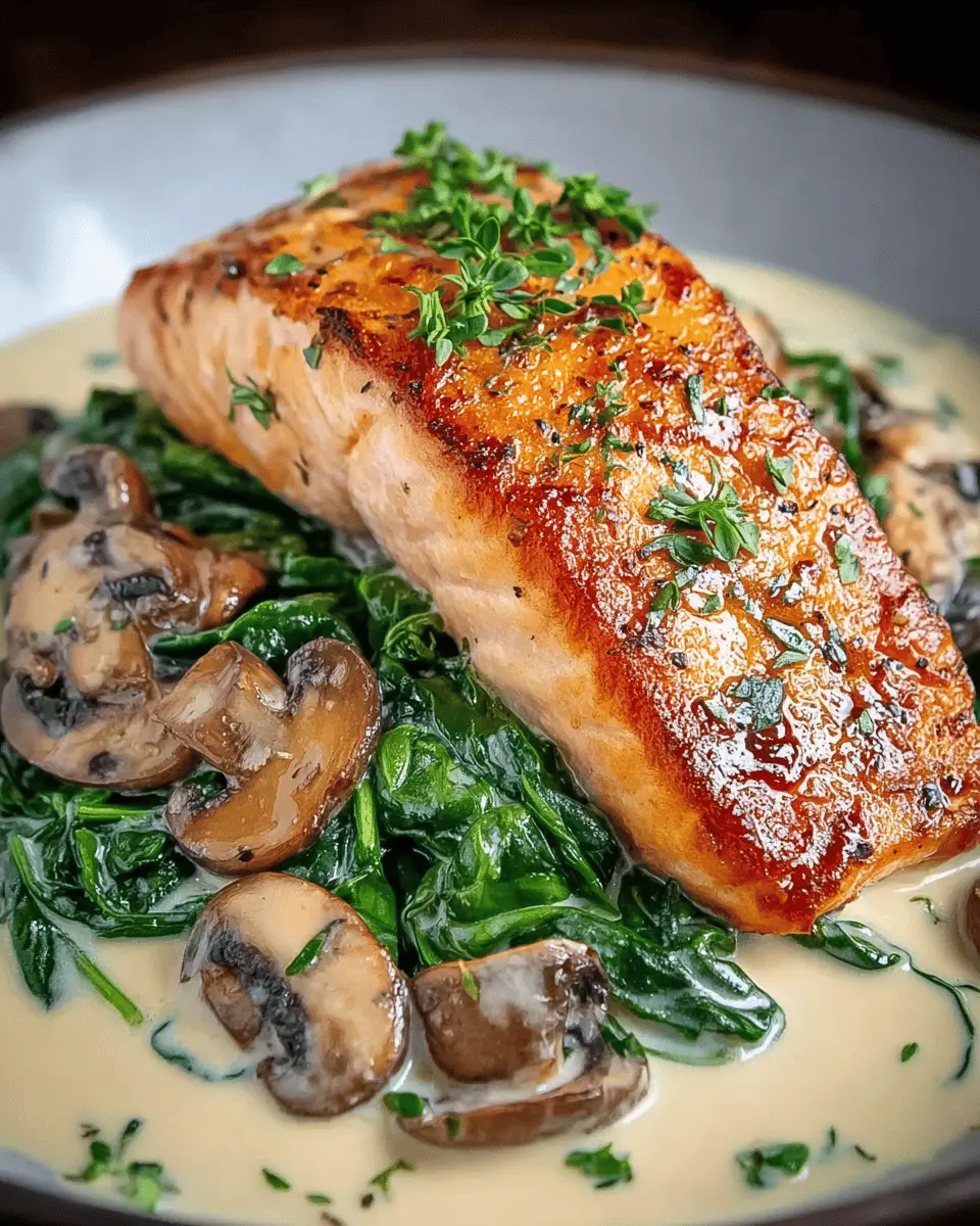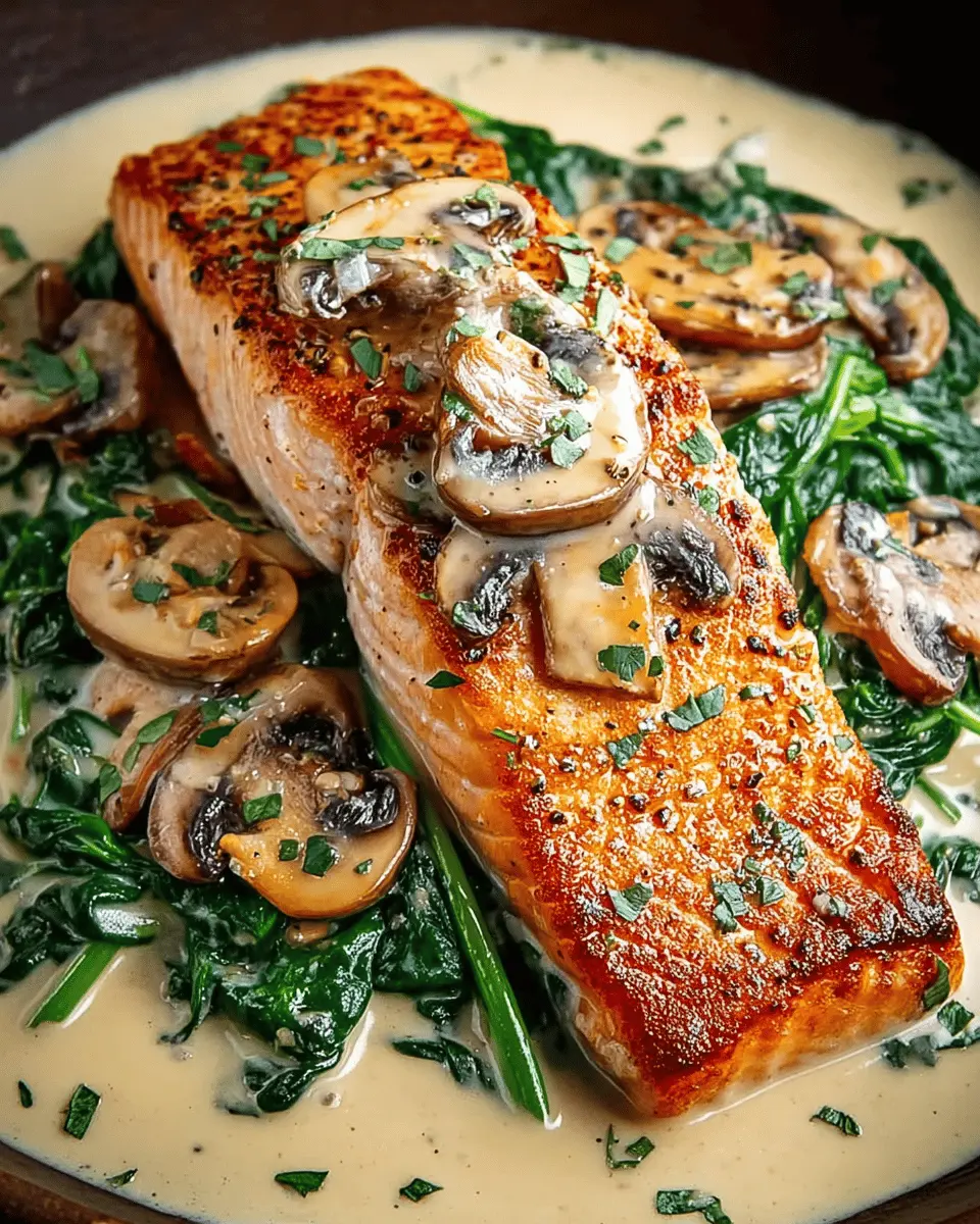 - Return the salmon to the skillet, spooning the creamy mushroom and spinach sauce over the fillets.