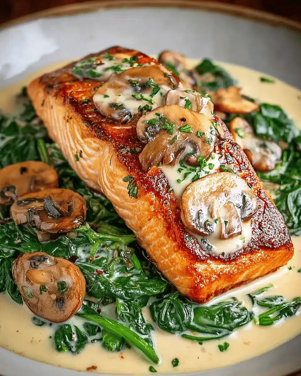 Garlic Butter Salmon: Indulgent Spinach & Mushroom Cream Sauce
