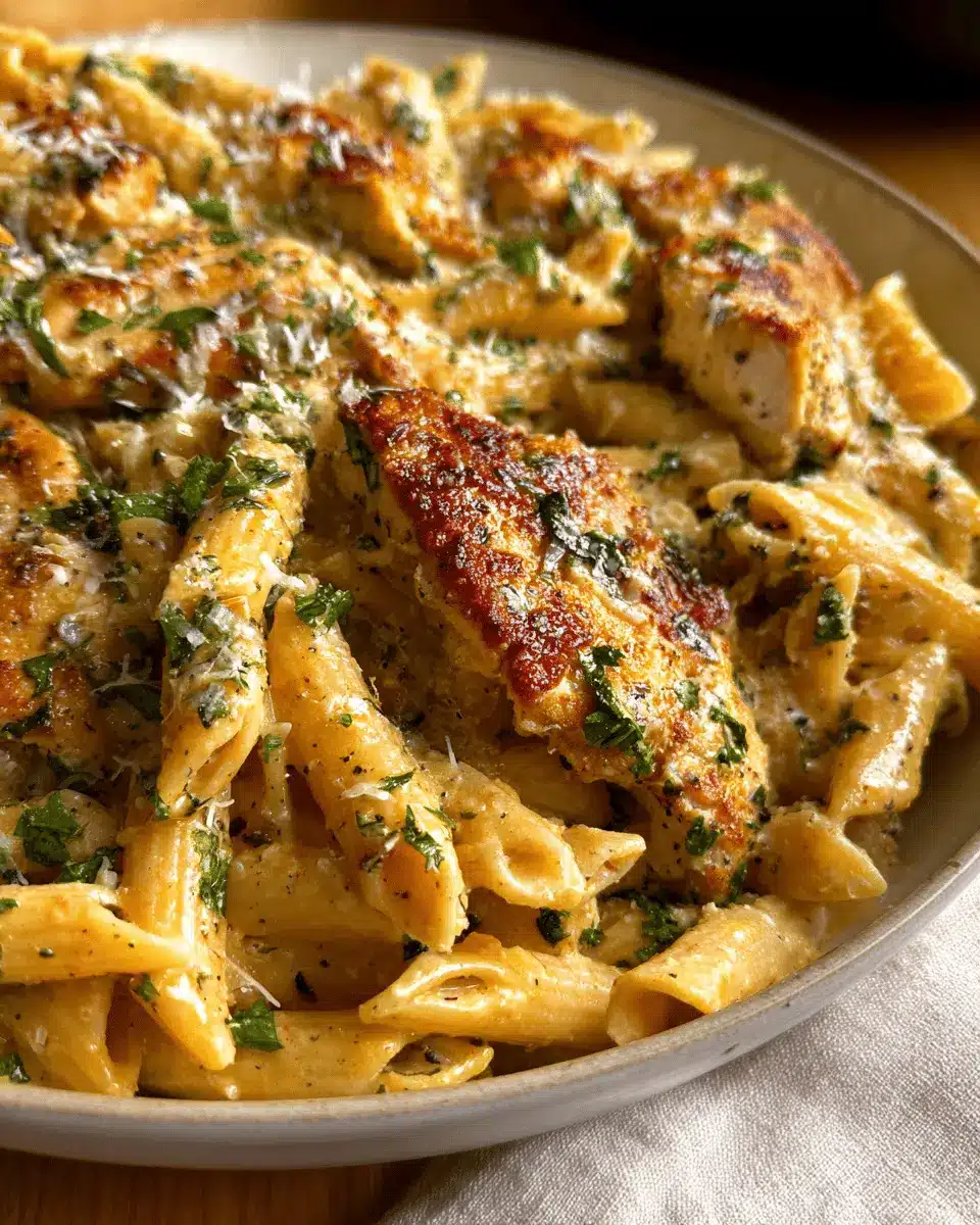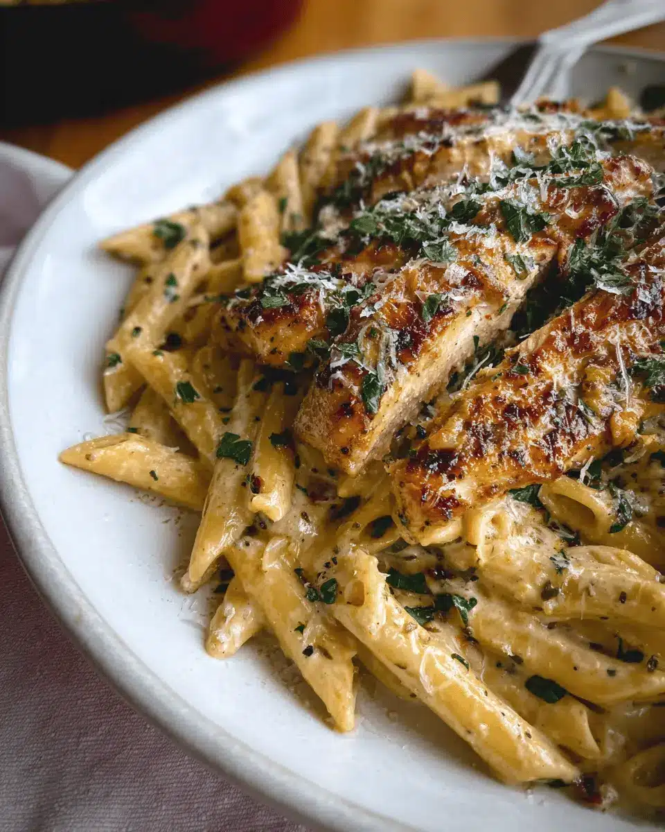 The chicken takes center stage in this recipe, delivering protein and flavor that pairs perfectly with the rich pasta.