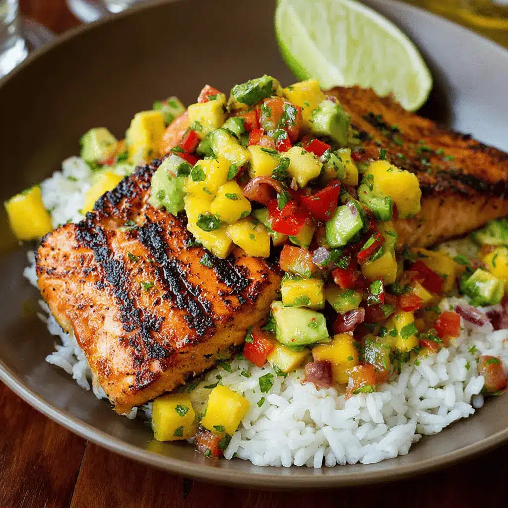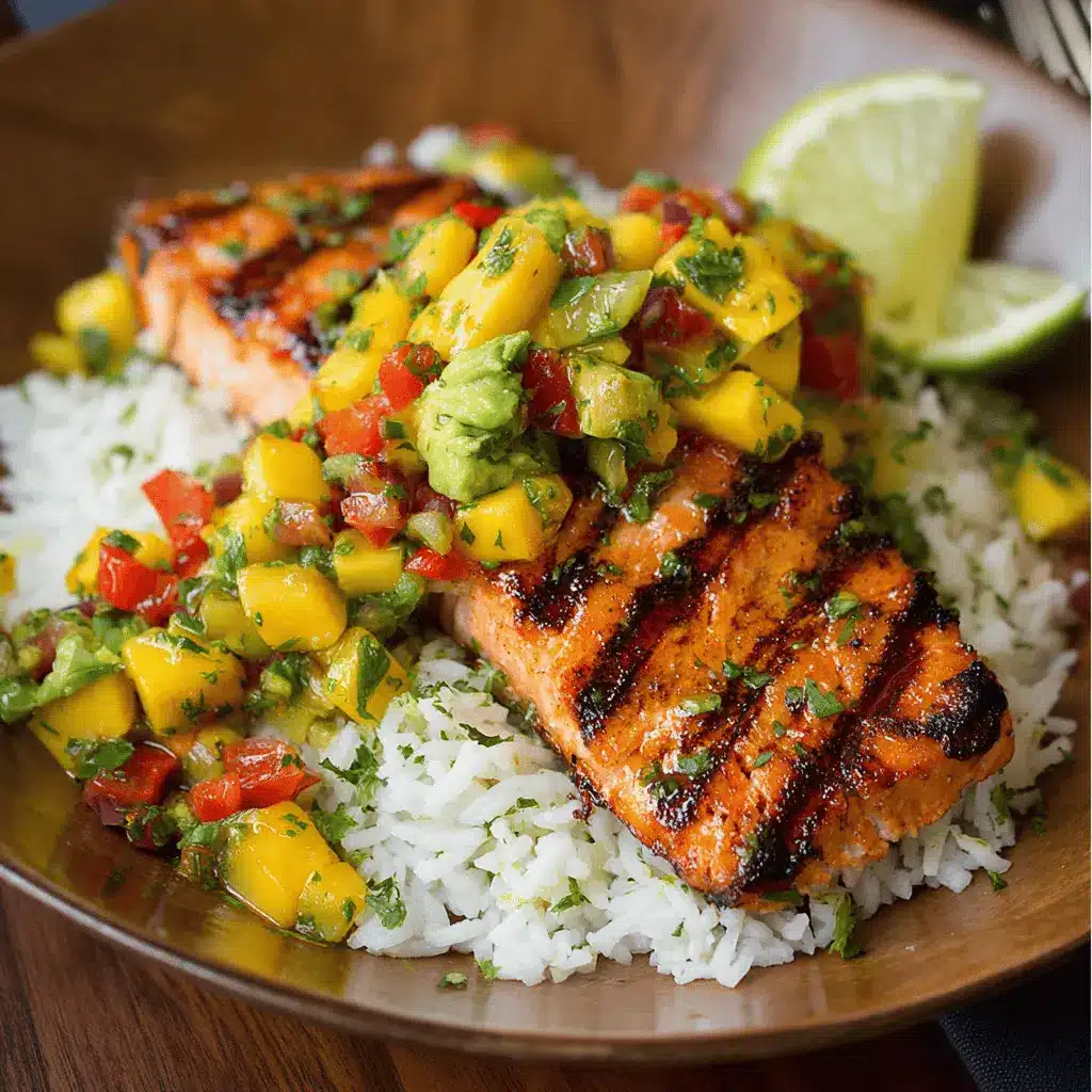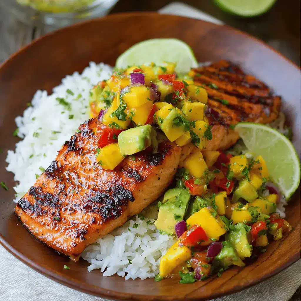 Grilled Lime Salmon with Avocado-Mango Salsa and Coconut Rice