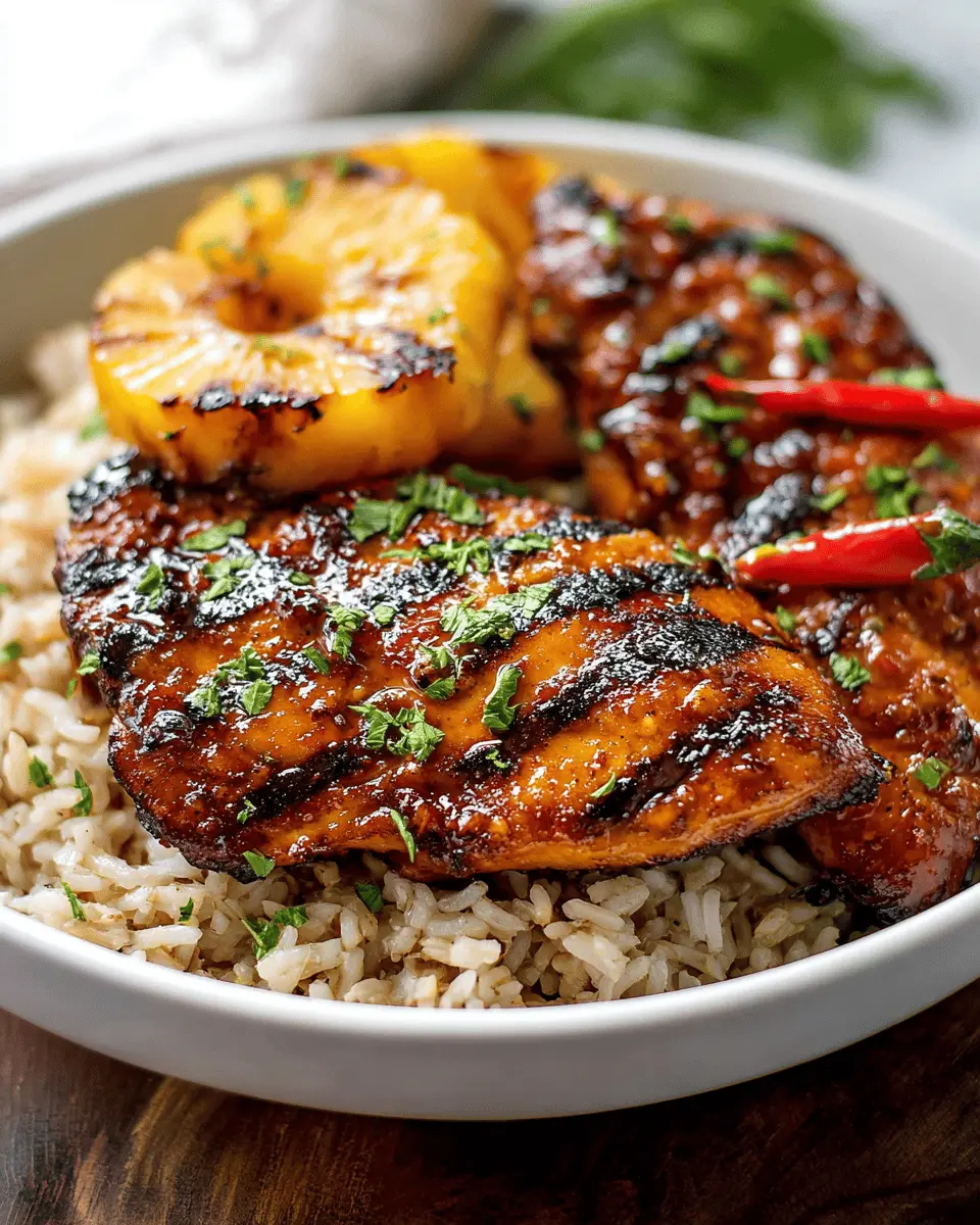 Your chicken will be ready in no time! Preheat your grill (or grill pan if you're cooking indoors). Cook the marinated chicken until it reaches an internal temperature of 165℉, flipping halfway through for even cooking. As a fun addition, slice those grilled pineapples into ½ to 1-inch thick rings and grill them alongside the chicken for a sweet smoky flavor.