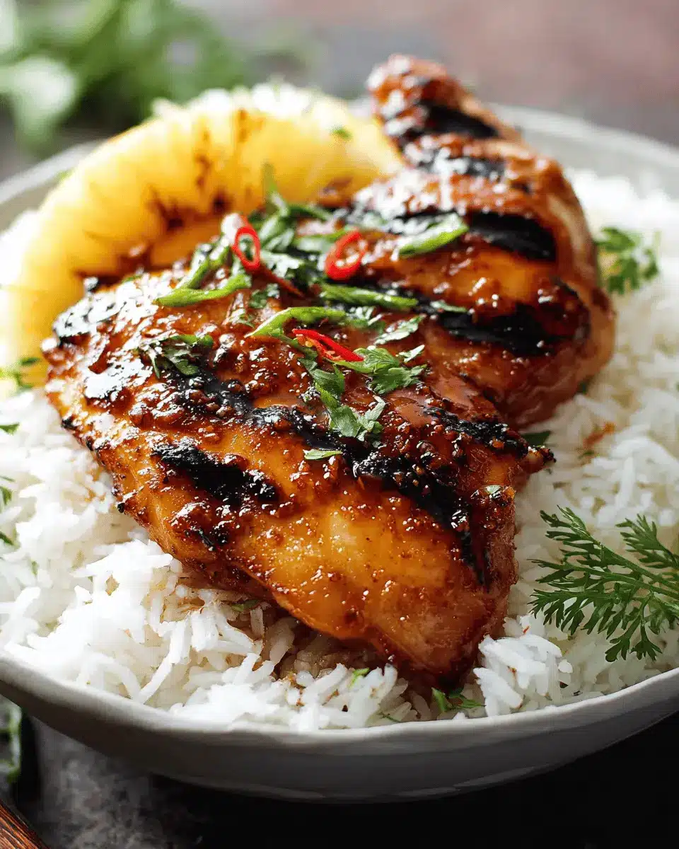 Now comes the fun part! Place a generous scoop of your coconut rice on each plate, layer in the grilled chicken and pineapple, and finish with a sprinkle of fresh parsley. Not only does it taste amazing, but the vibrant colors make for a beautiful presentation. Enjoy your Hawaiian Chicken with Coconut Rice with friends, or keep it all for yourself—it's just that delicious!