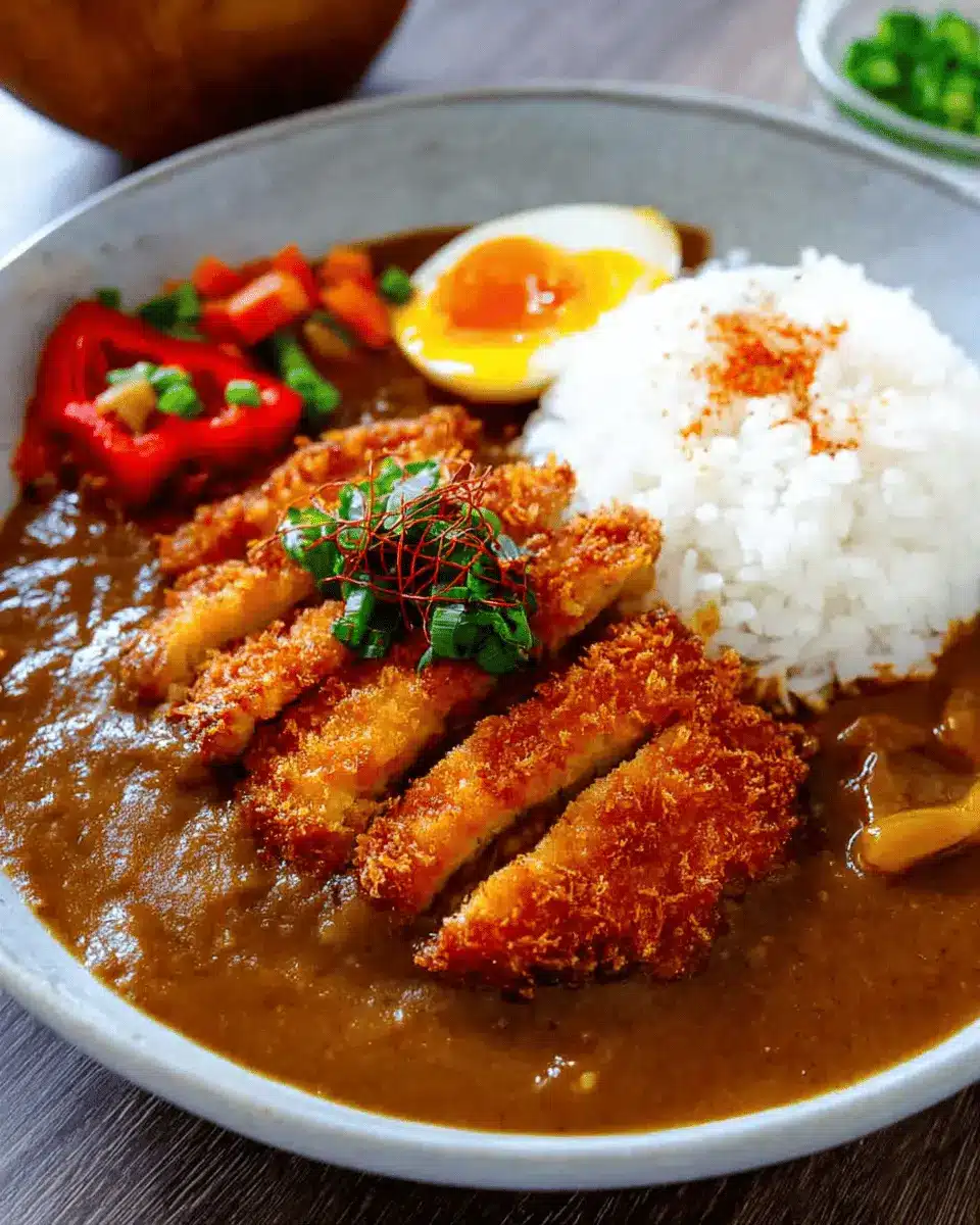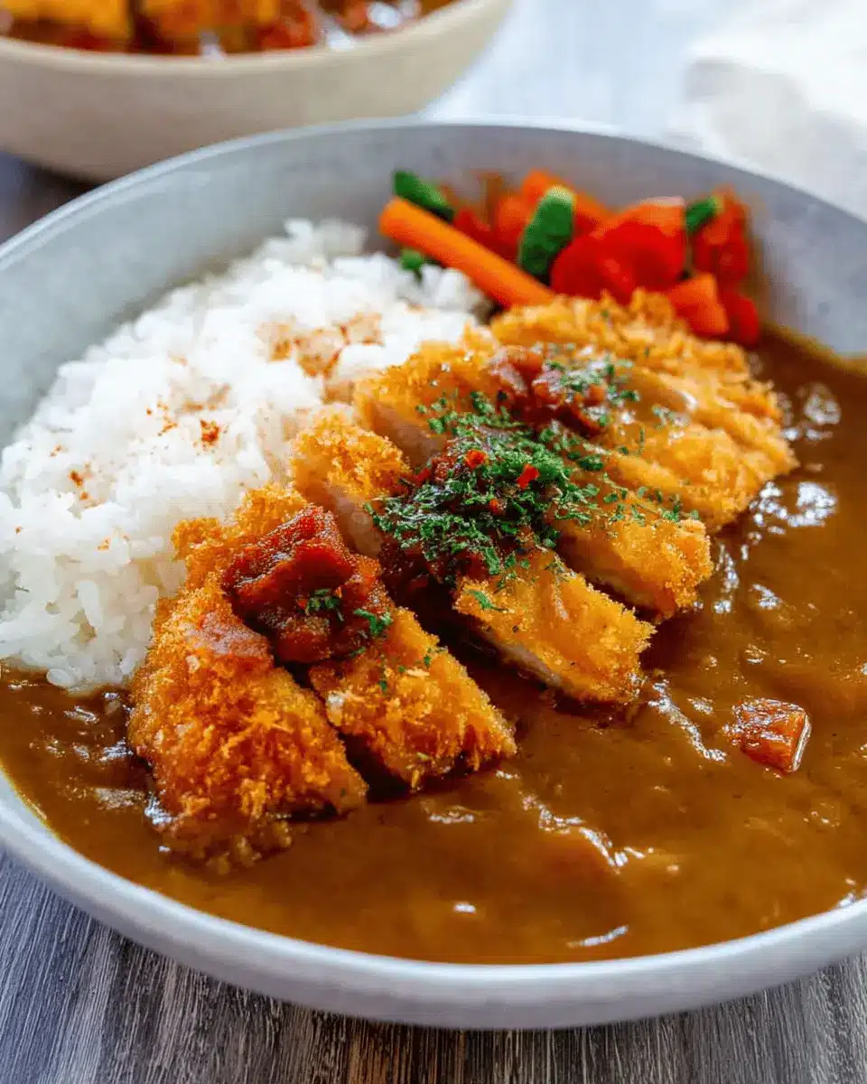 To serve, plate a cup of hot cooked rice on one side of your dish, followed by the chicken cutlets leaning against it. Pour generous amounts of the rich curry sauce over the chicken and rice, and don’t forget to place a small scoop of fukujinzuke on the side. This vibrant meal is not just delicious; it’s a feast for the eyes!