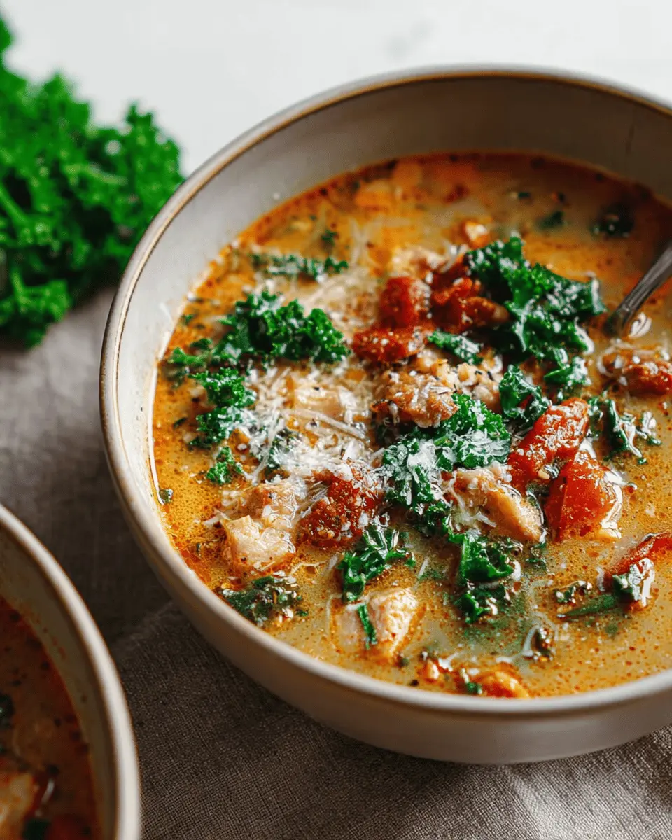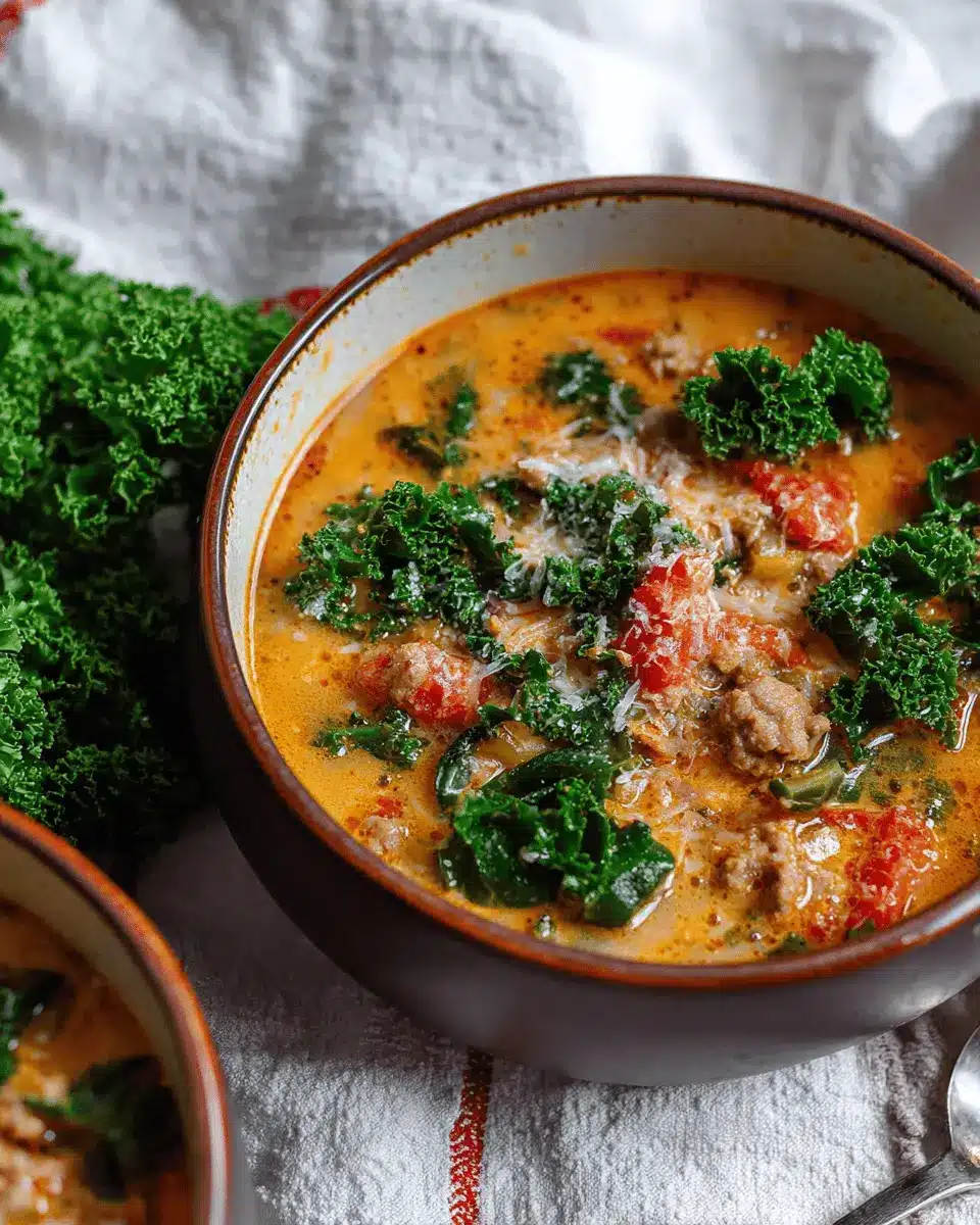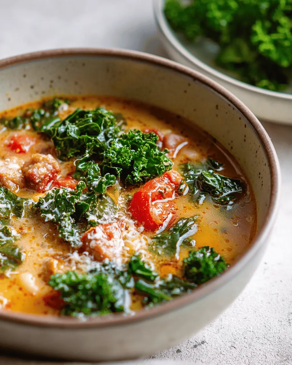 To make your soup creamy and luscious, pour in the heavy whipping cream and stir well. The cream will give your soup a rich, velvety texture that complements the sausage and kale perfectly. For the finishing touches, serve your soup in bowls and garnish with grated parmesan cheese and fresh parsley. It’s perfect for a cozy dinner!