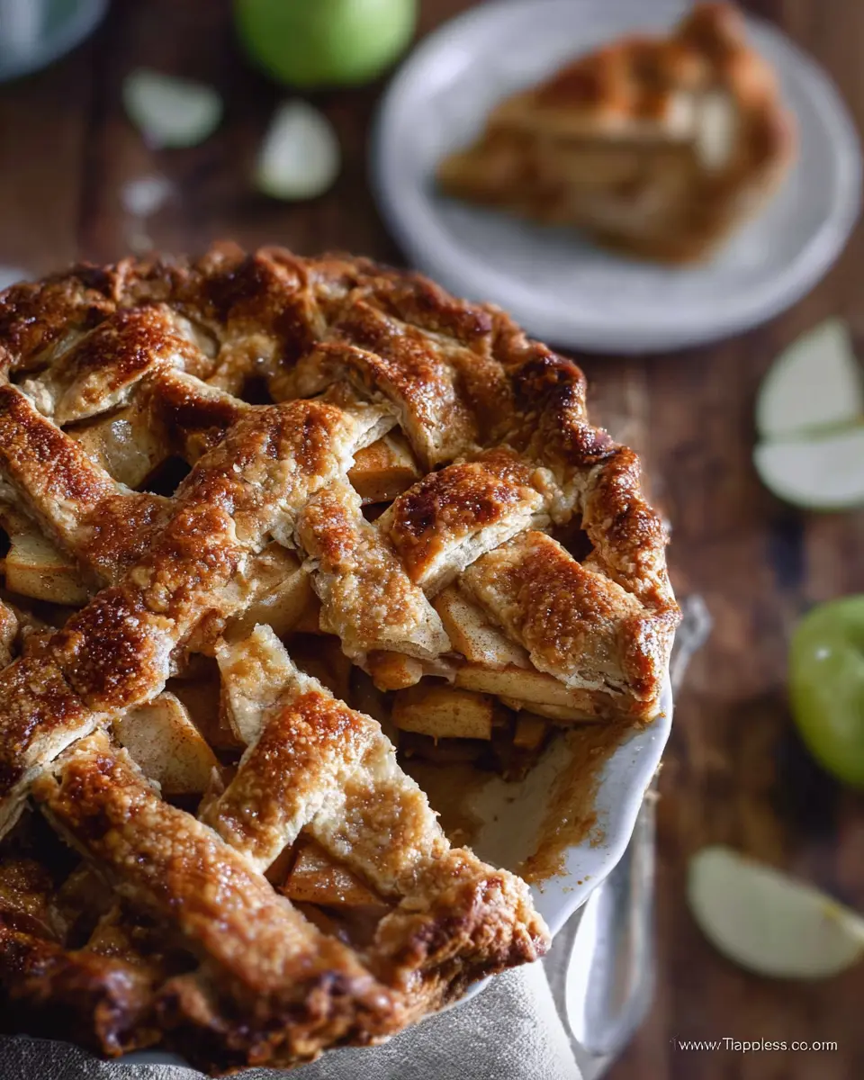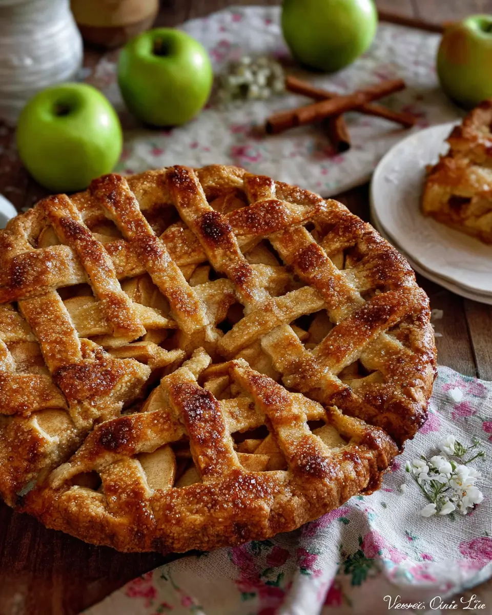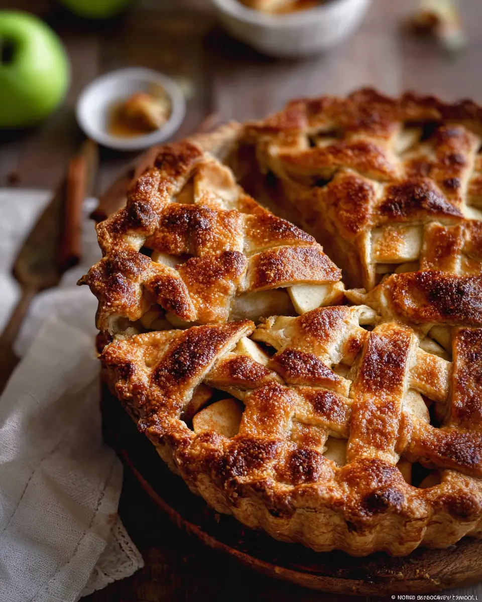 Before popping your American Apple Pie in the oven, preheat it to 190°C. Brush the lattice with an egg wash (mix 1 egg with 1 tablespoon of water) and sprinkle with a bit of sugar for that lovely glaze. Bake for about 50 minutes, checking after 20 minutes to cover the edges with foil if they brown too quickly. When the juices start bubbling, you know it’s almost time to indulge!