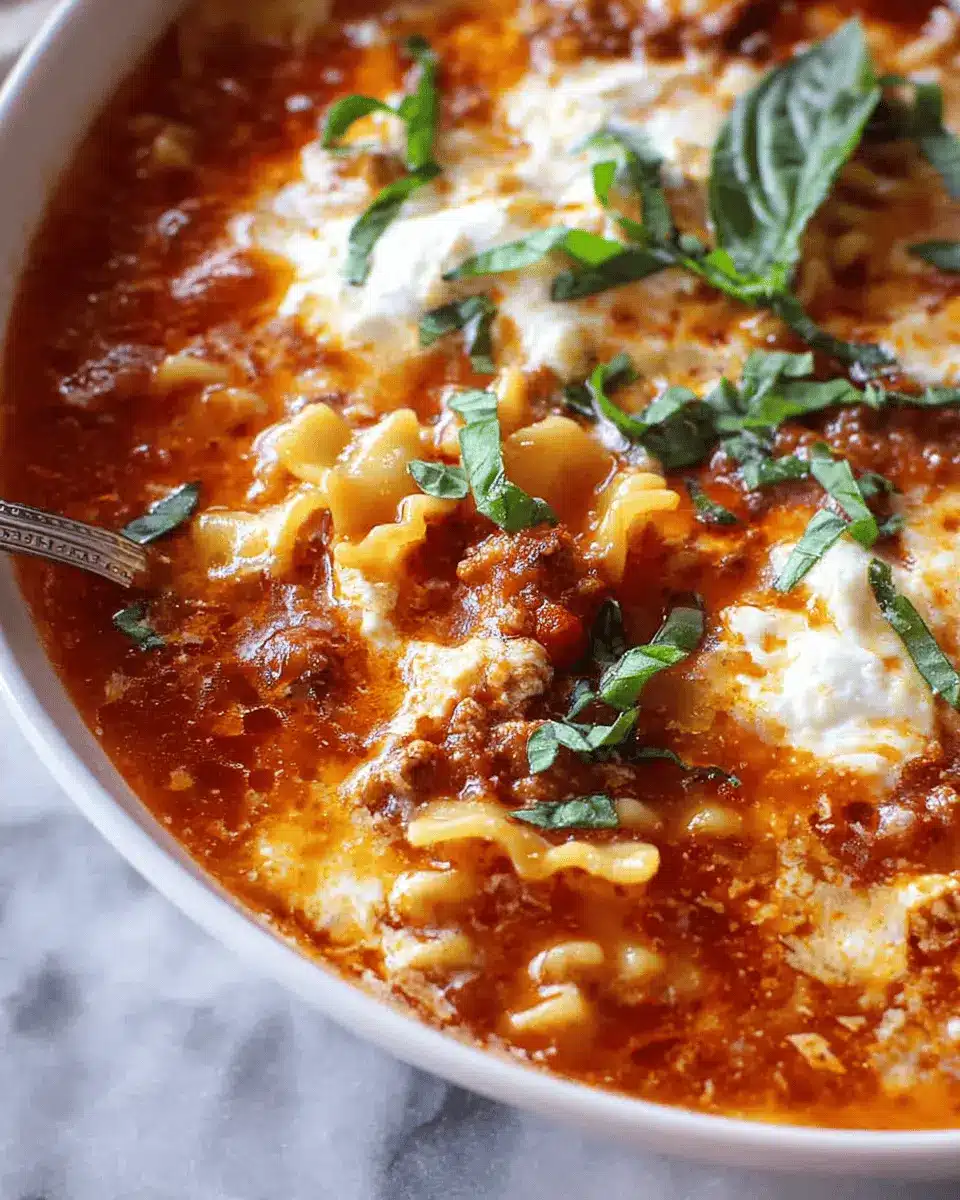 Finally, ladle your steaming lasagna soup into bowls. Don’t forget to add a generous dollop of the cheese mixture on top, allowing it to melt slightly into the hot soup. Garnish with fresh basil for that final touch of freshness. Enjoy your delicious meal with some crusty bread for dipping!