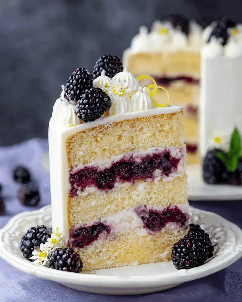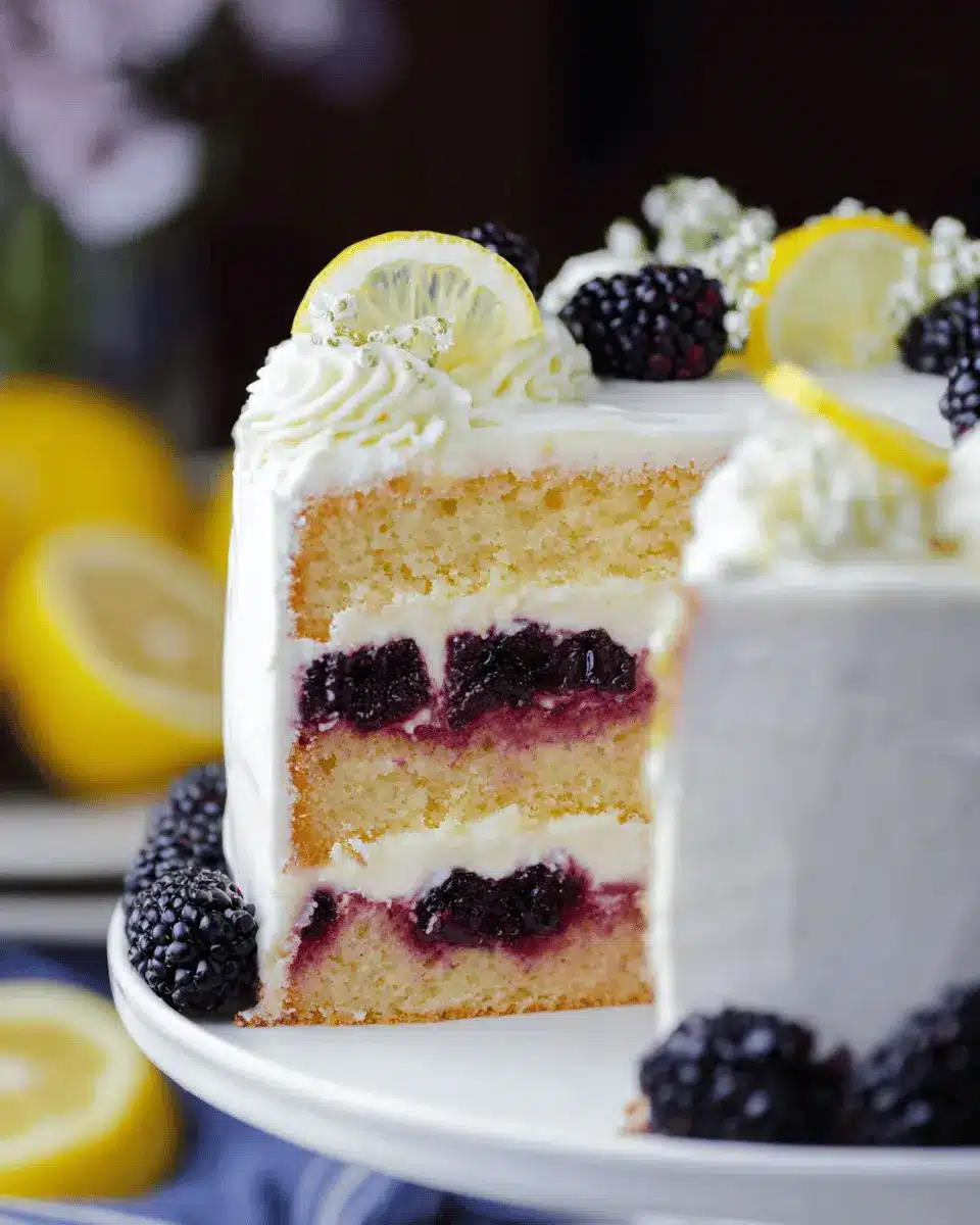 Make the presentation pop! Top your lemon blackberry cake with fresh blackberries and a sprinkle of lemon zest for a vibrant touch. You can also add edible flowers or a dusting of powdered sugar for a whimsical look. A drizzle of homemade lemon curd around the plate adds a splash of color and a tangy contrast that your guests will love!