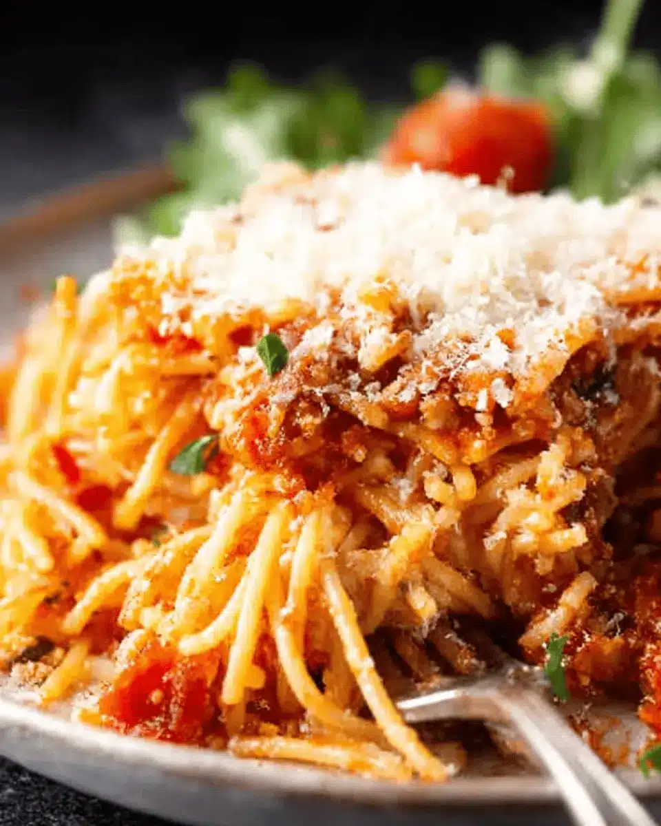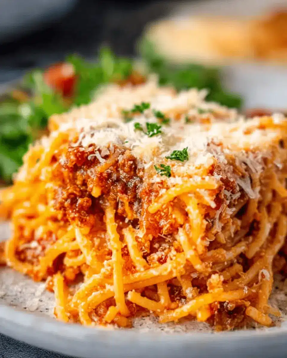 Preheat your oven to 350 degrees F. Bake the assembled Million Dollar Spaghetti for 30-40 minutes, or until it’s hot and bubbling. Keep an eye on the cheese; if it starts to brown too quickly, cover it loosely with aluminum foil. Let it rest for at least 15 minutes after baking to allow it to set up before serving.