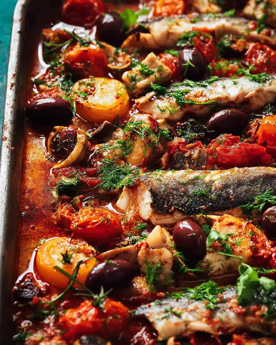 The heart of this Puttanesca fish tray bake lies in the sauce. You’ll need 1 medium fennel bulb, about 1½ cups of cherry or grape tomatoes, ½ cup of pitted kalamata olives, and minced garlic and capers for that punchy flavor. Don’t forget the anchovy fillets; they add depth and umami. You can also include crushed canned tomatoes, chili flakes for a hint of heat, and a mix of dried oregano to tie it all together.