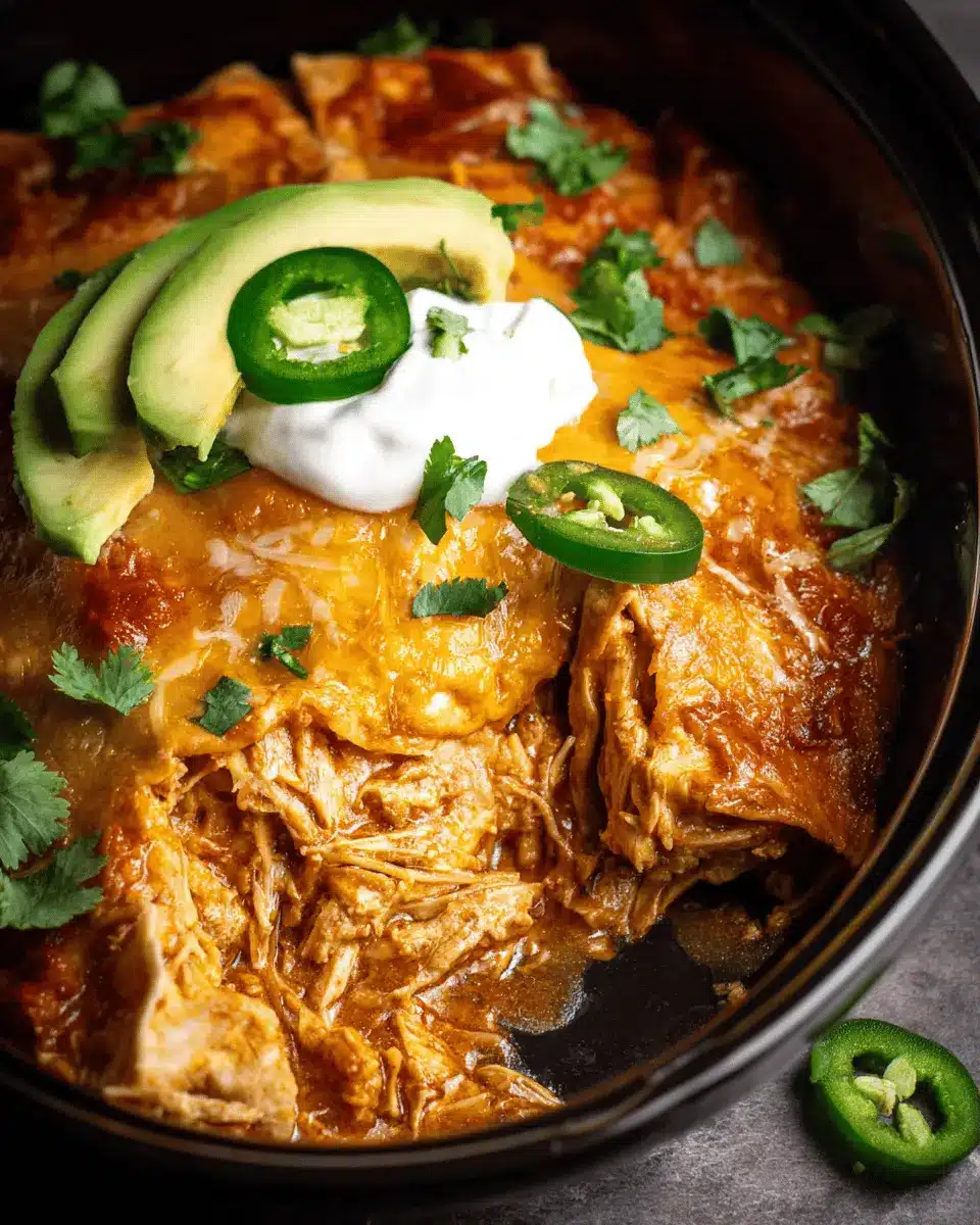 Once the cheese is gooey and delightful, it’s time to serve! Garnish your slow cooker chicken enchiladas with freshly sliced jalapeño peppers and chopped cilantro for a pop of color and flavor. For an extra touch, consider adding sliced avocado or a dollop of sour cream on top. You can serve these enchiladas over a bed of delicious cilantro lime rice for a complete meal.