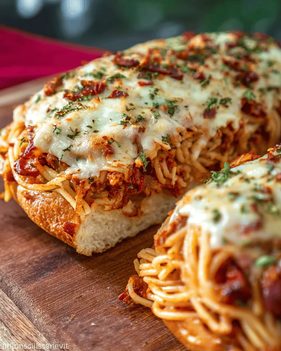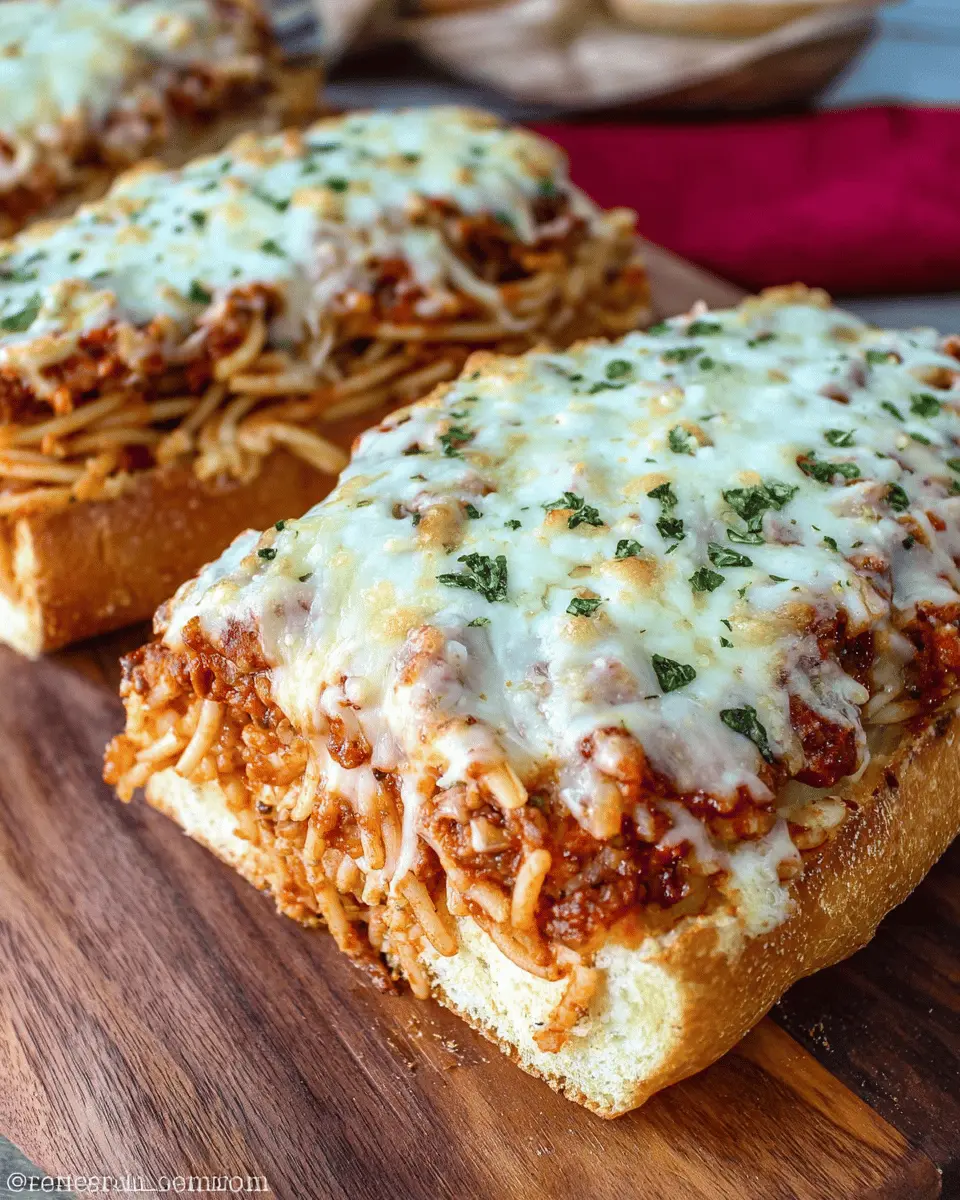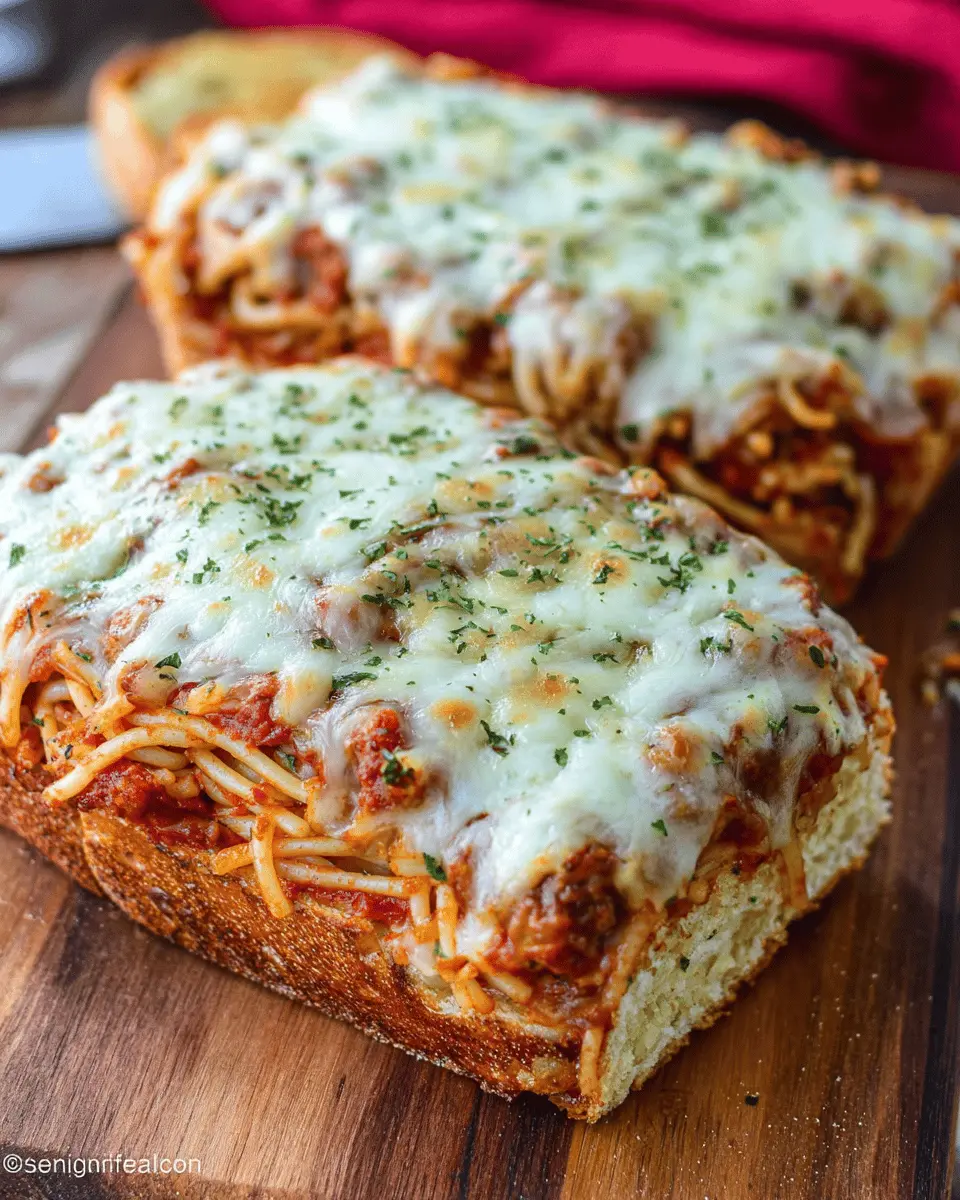 The beauty of this dish lies in its versatility. It’s ideal for cozy family dinners, game day gatherings, or even for a cozy night in with your favorite movie. Each bite of spaghetti stuffed garlic bread combines the warmth of garlic and herbs with the rich, satisfying textures of pasta and cheese.