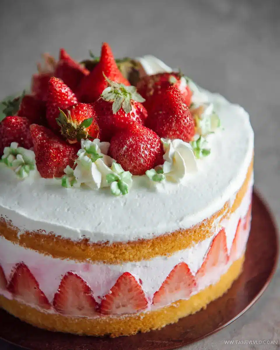 Once your cake has cooled, slice it into three layers. Each layer should generously be filled with whipped cream and fresh strawberries before being stacked. Finish by frosted the entire cake with more whipped cream, and don’t forget the fresh strawberries on top for that visual touch!