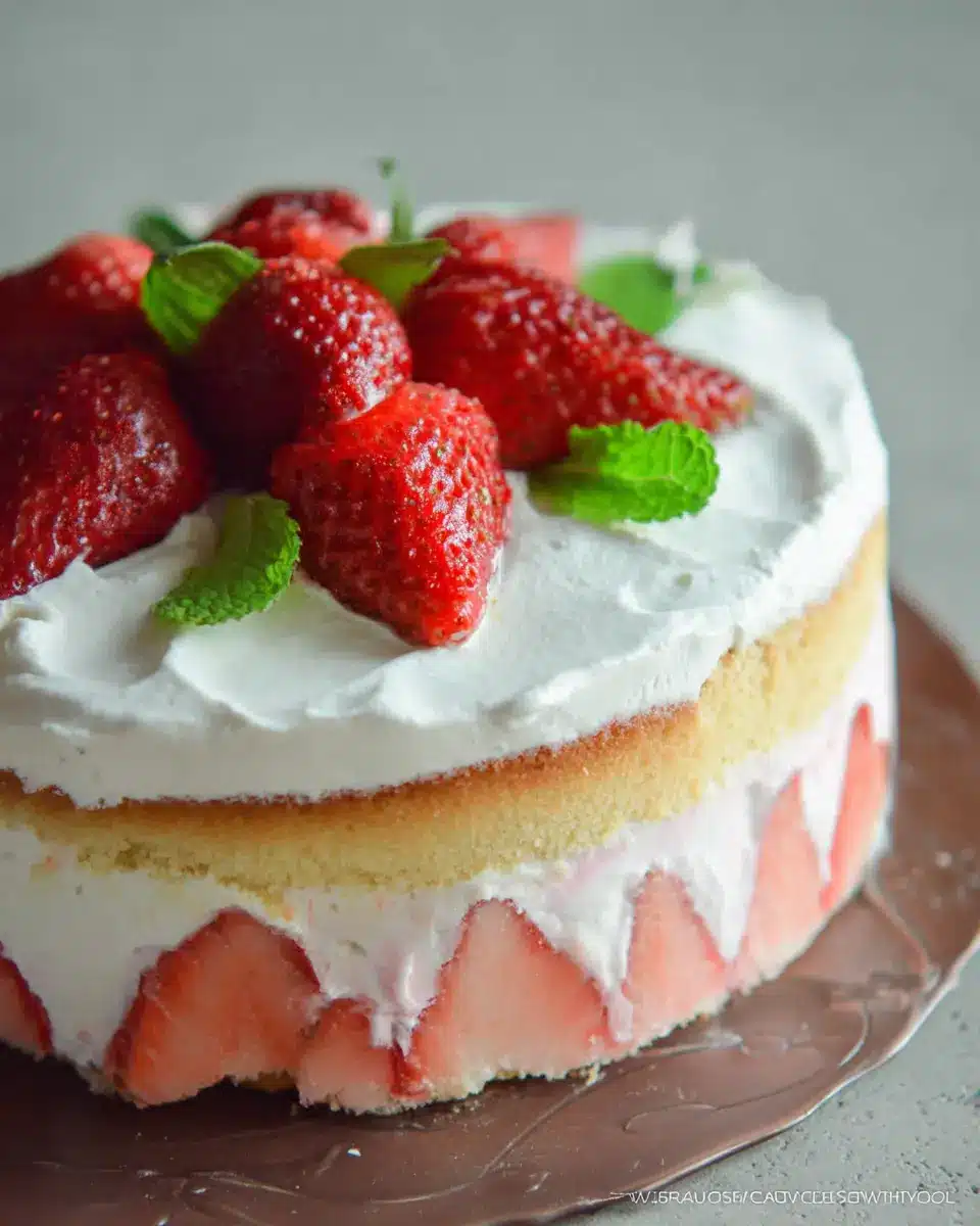 - Use remaining whipped cream to frost the cake and decorate with strawberries.