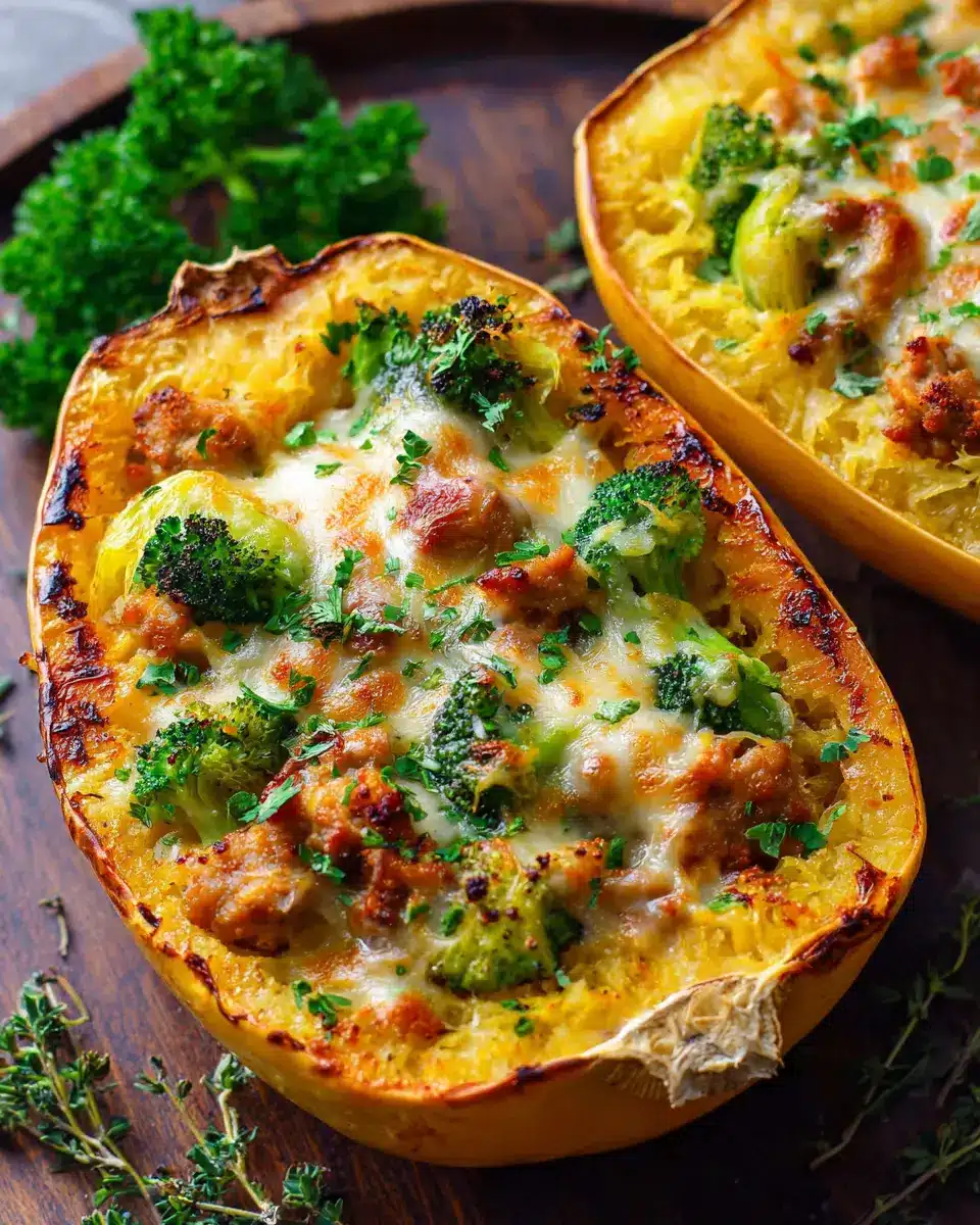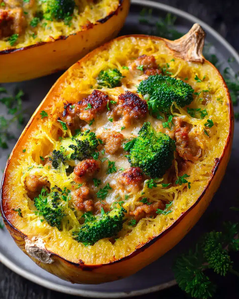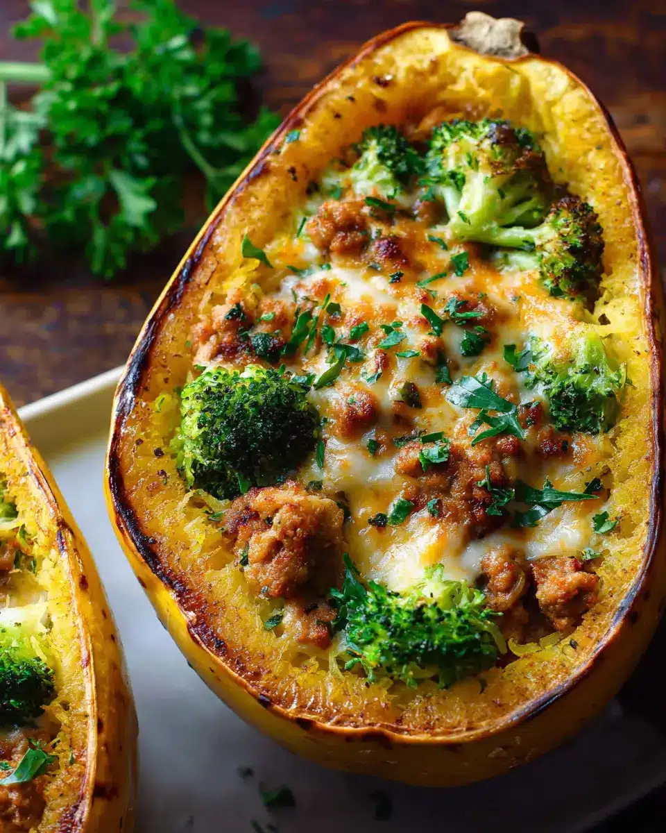 Stuffed Spaghetti Squash with Broccoli, Sausage, and Cheddar Cheese