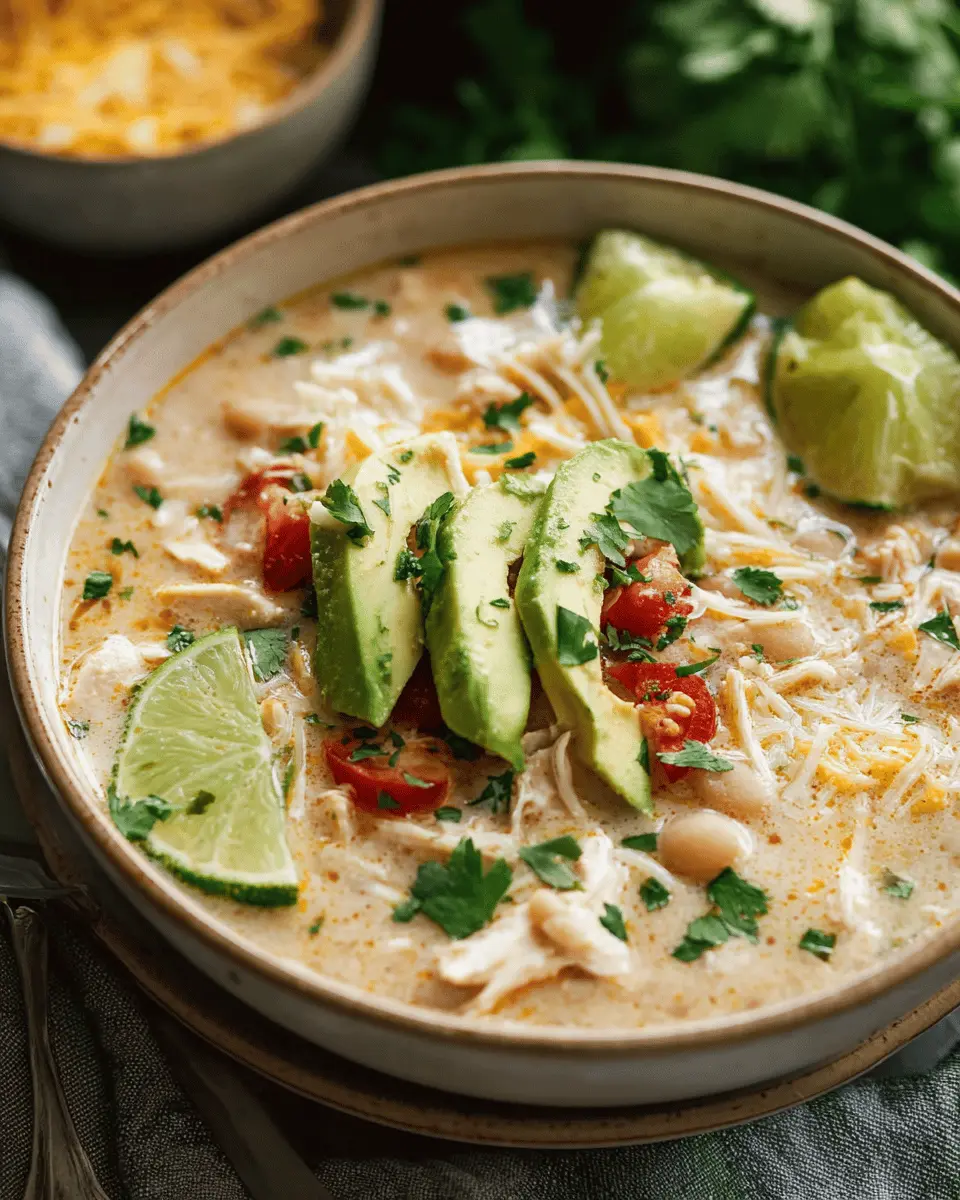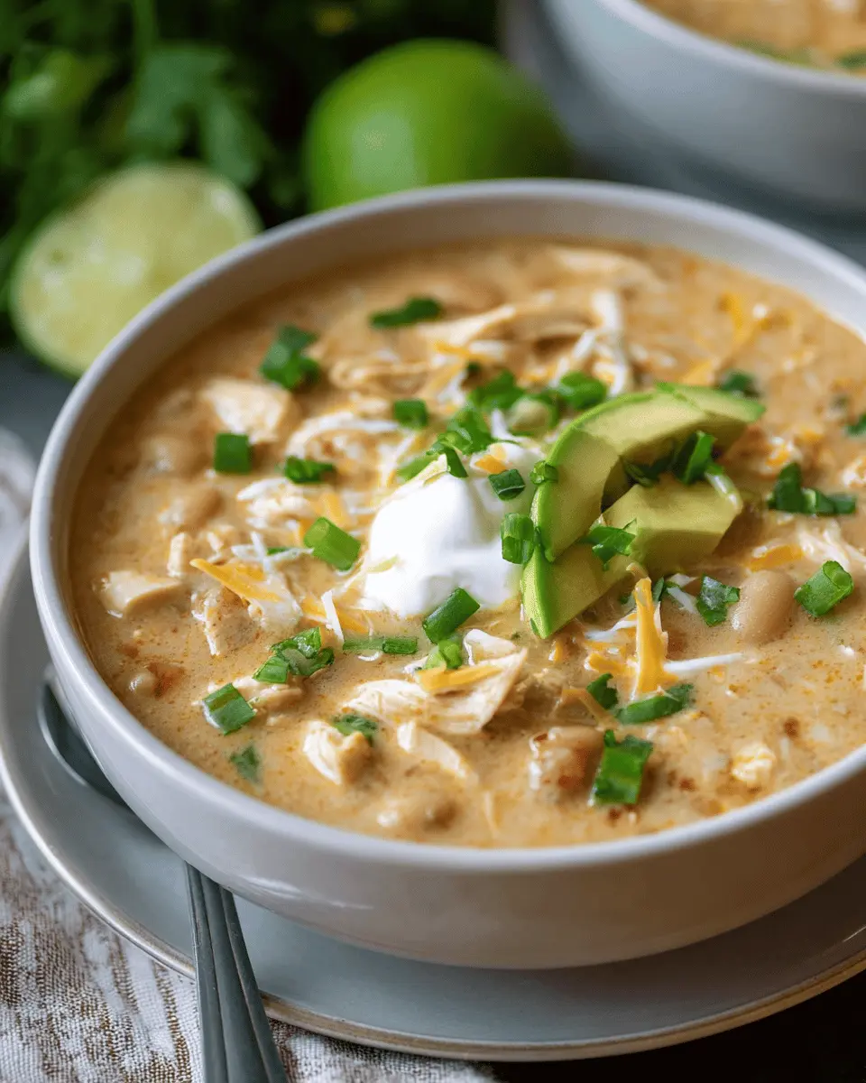 Finally, stir in 2½ cups of shredded cooked chicken (using rotisserie chicken is a game-changer here) along with a tablespoon of fresh lime juice and 2 tablespoons of chopped fresh cilantro. The lime juice adds a zesty brightness that balances the richness of the chili. Serve your masterpiece hot, garnished with a sprinkle of cheese, more cilantro, avocado slices, and some tortilla chips for that added crunch.